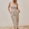 Siéntete elegante y sofisticada con este mono de lino largo con estampado selva beige.