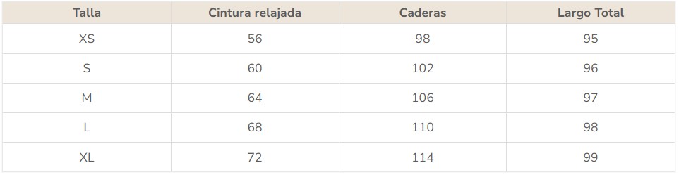 Las medidas están especificadas en centímetros. La producción se realiza de forma manual, por lo que puede haber pequeñas variaciones. Compara estas dimensiones con tu contorno de cintura, cadera y con tu altura.