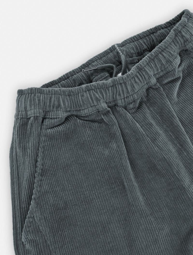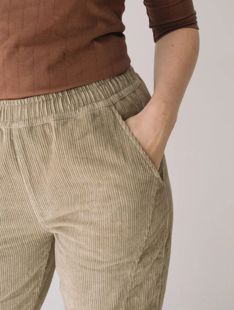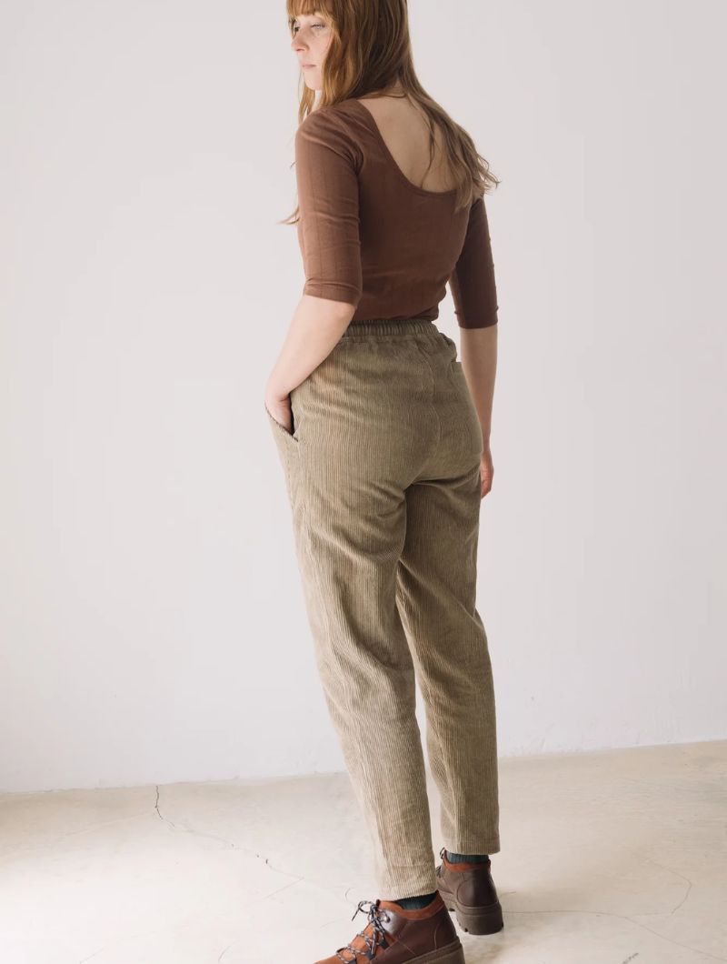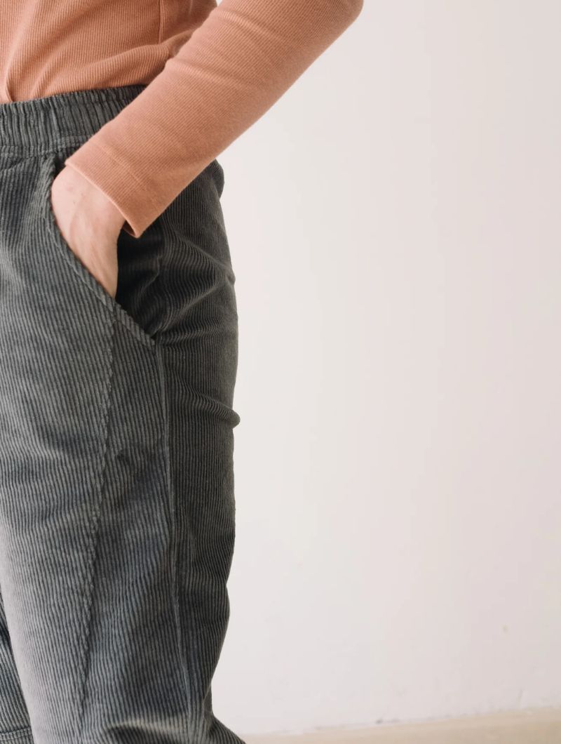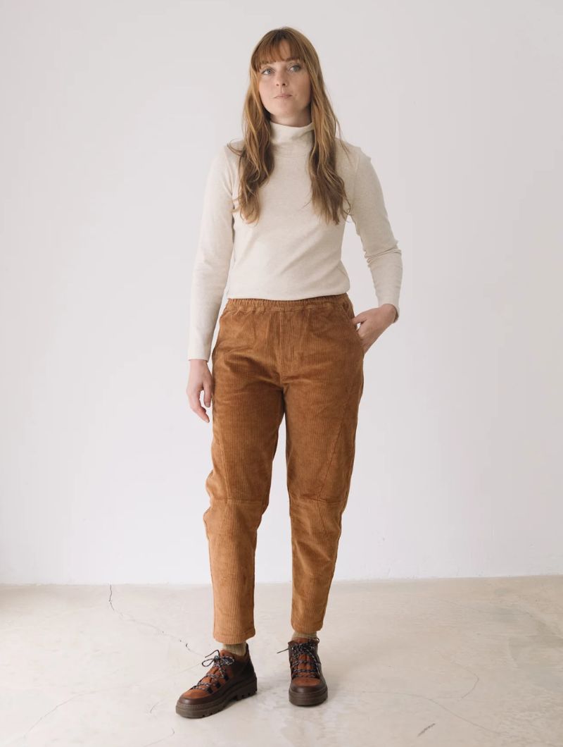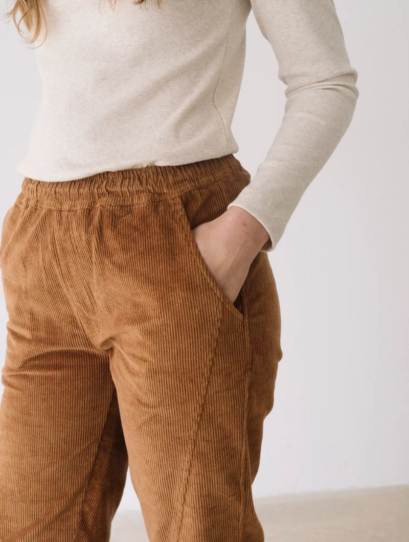 Pantalón de pana gruesa con cintura elástica, bolsillos laterales y costuras delanteras que dan estructura sin perder comodidad. Su corte relajado y la cintura elástica aportan comodidad y libertad de movimiento, manteniendo un estilo cuidado y versátil.