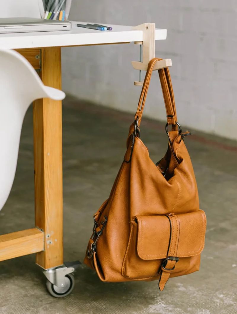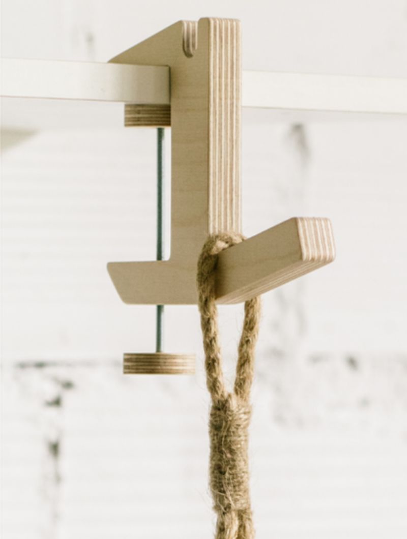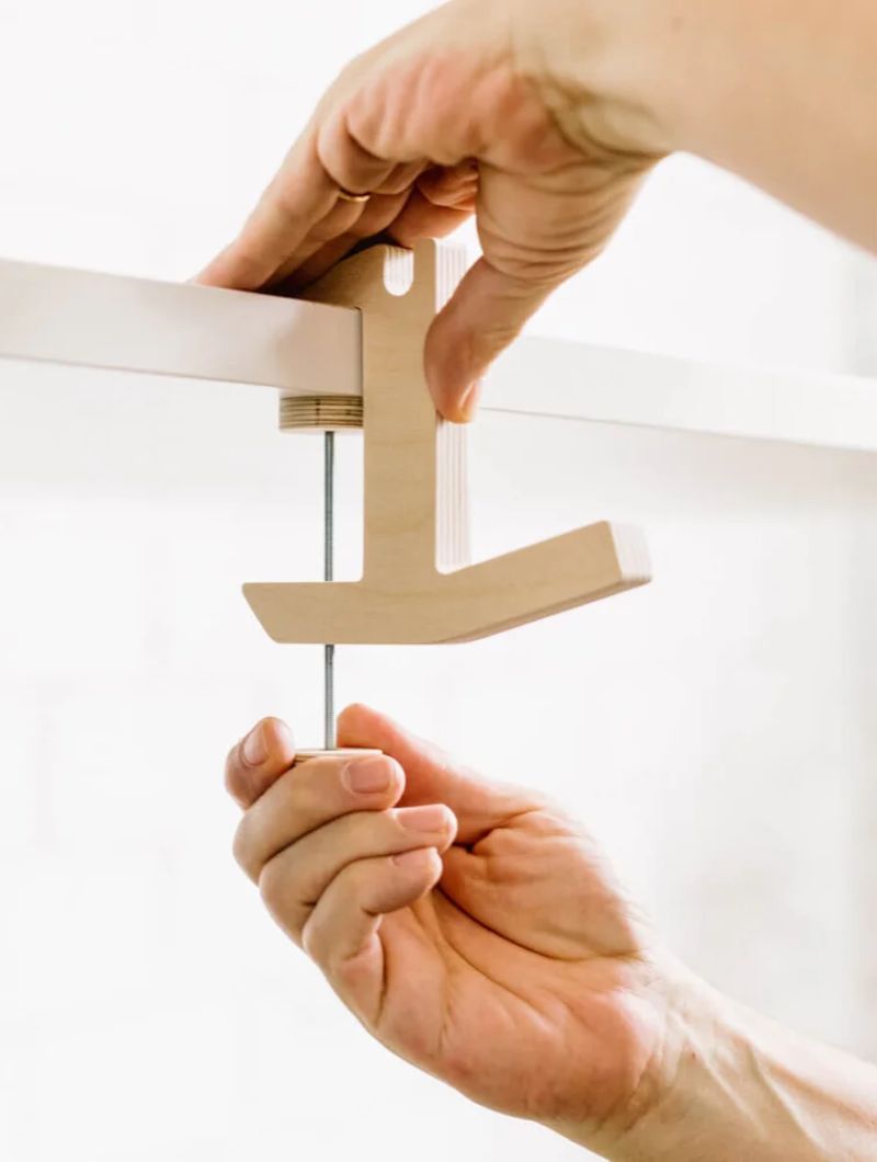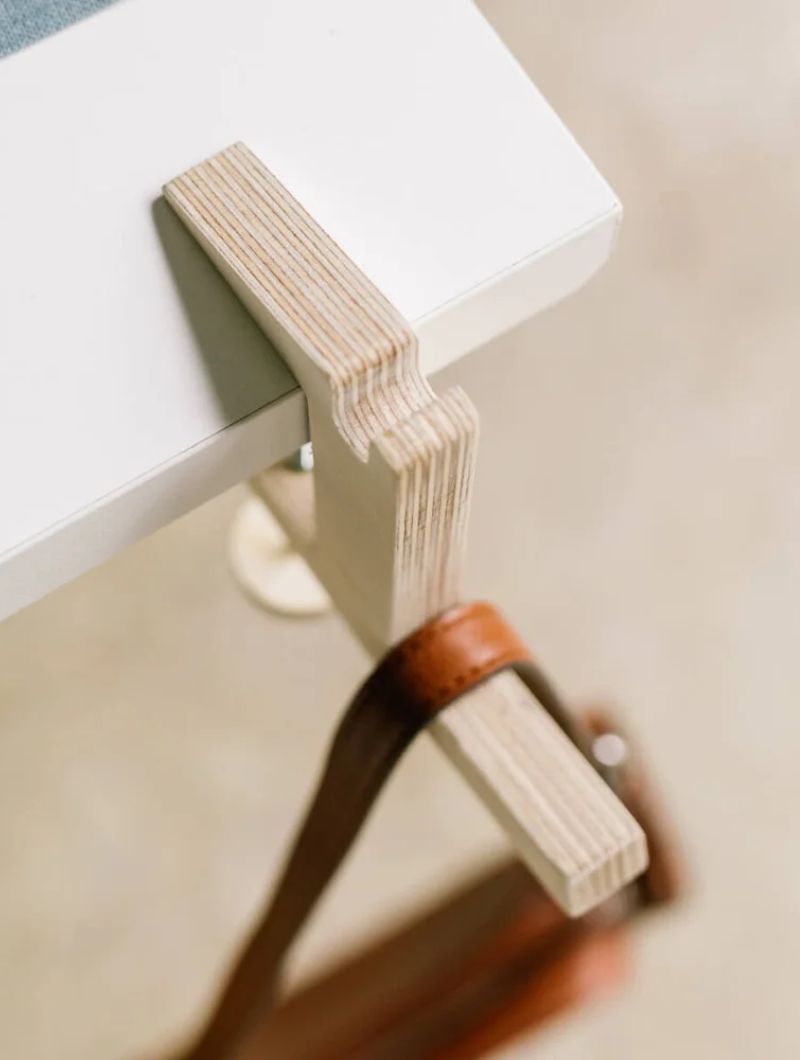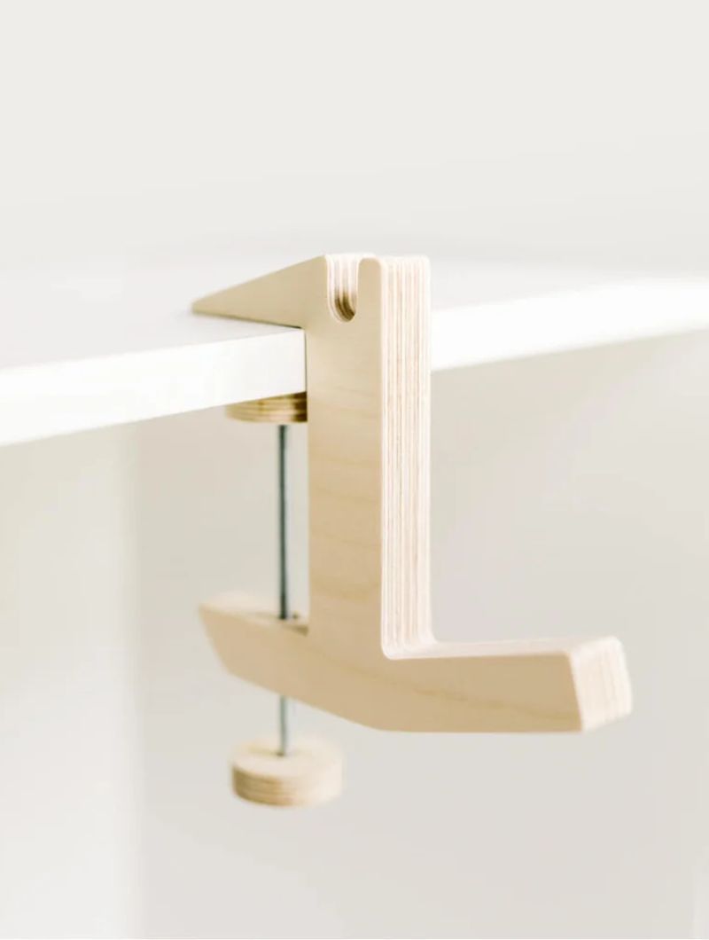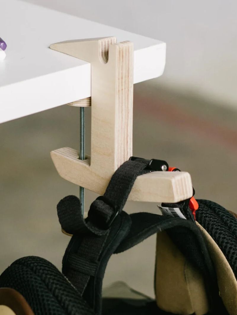 Percha portátil de madera pensada para mantener el espacio ordenado sin hacer agujeros ni usar tornillos. Se ajusta a cualquier superficie plana de hasta 6 cm de grosor —una mesa, una estantería o incluso una barandilla— y se puede mover tantas veces como quieras.