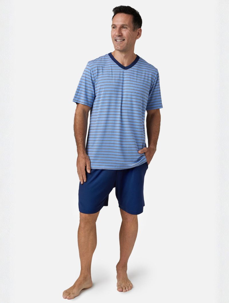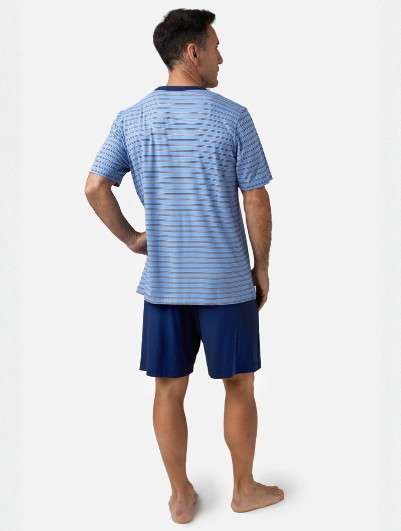 Pijama corto para hombre en una combinación de azules con líneas limpias y contrastes suaves.