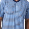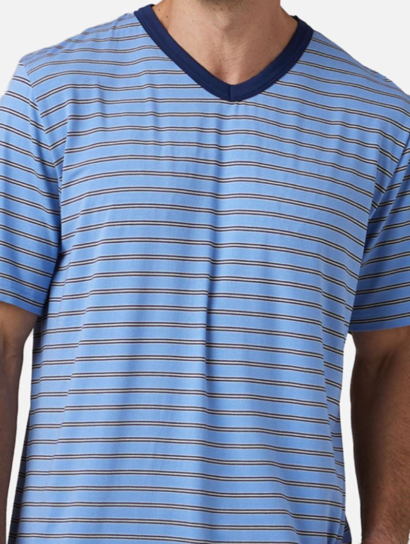 La camiseta de manga corta presenta un diseño de rayas horizontales en diferentes tonos, con escote en pico y acabados lisos en cuello y mangas que aportan definición y equilibrio visual. El pantalón corto, en azul liso más intenso, completa el conjunto con una estética bien compensada.