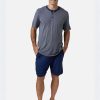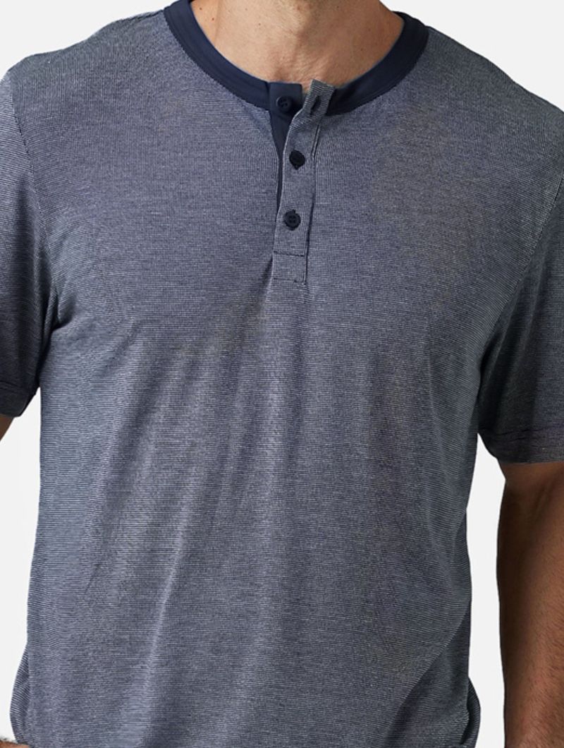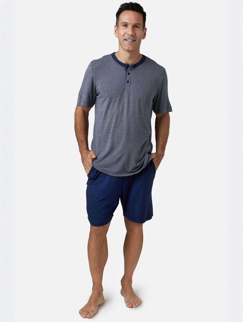 Pijama corto para hombre en tonos azul marino, con un diseño equilibrado y discreto. La camiseta de manga corta incorpora cuello tipo polo con una abertura sencilla y funcional, y un tejido de microestructura visual que aporta profundidad sin resultar llamativo. El pantalón corto, en azul liso, completa el conjunto con una estética limpia y bien definida.