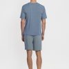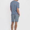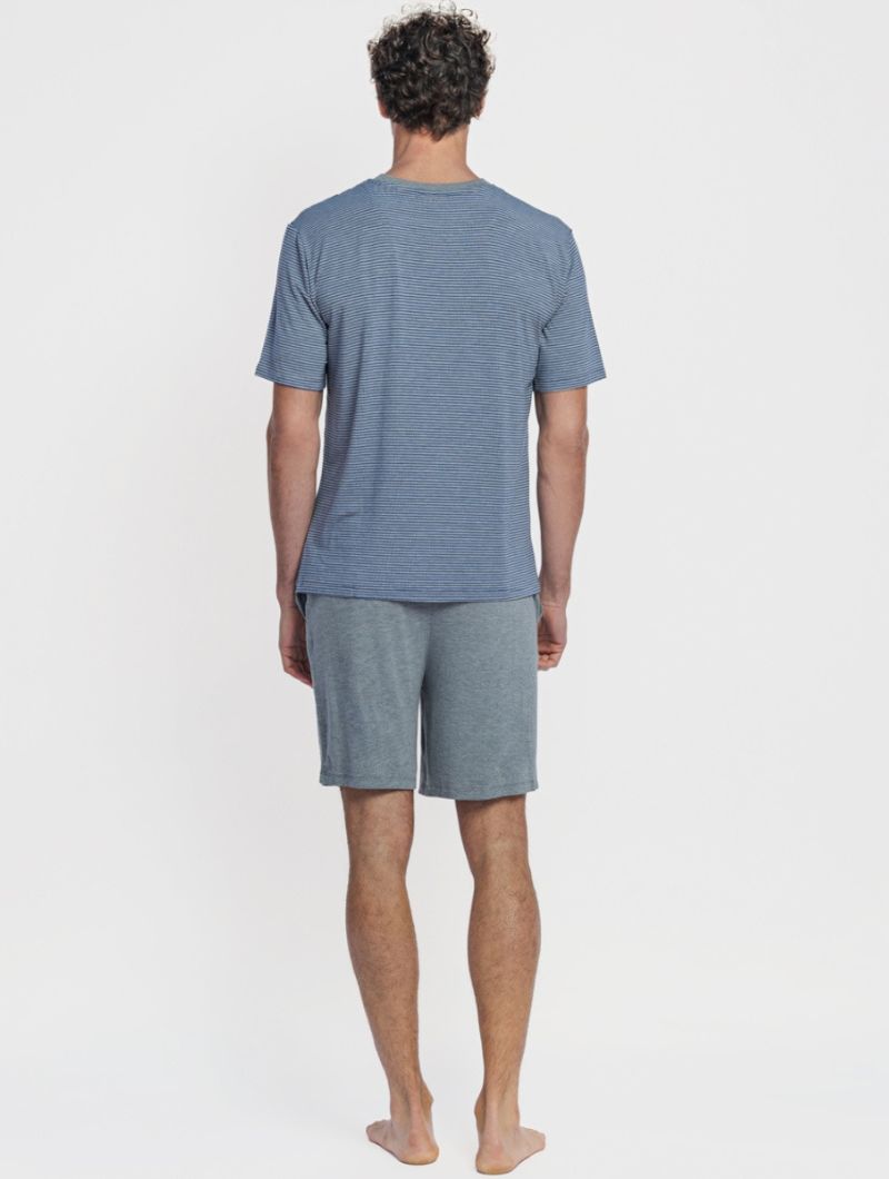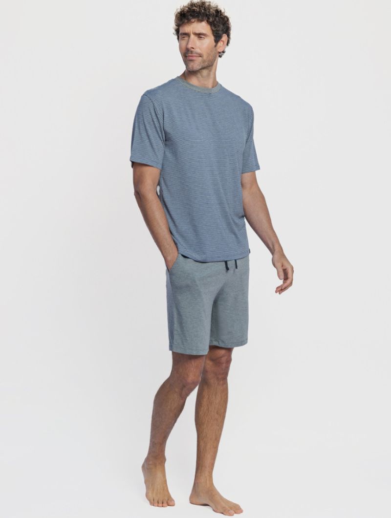 Pijama corto para hombre en tonos grises, compuesto por camiseta de manga corta con rayas finas y pantalón corto liso a juego. La parte superior presenta un patrón de rayado discreto, cuello redondo y un corte recto que aporta comodidad sin sensación de ajuste. El pantalón corto incorpora cintura elástica con cordón regulable, pensada para un uso cómodo y funcional durante la noche.