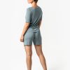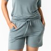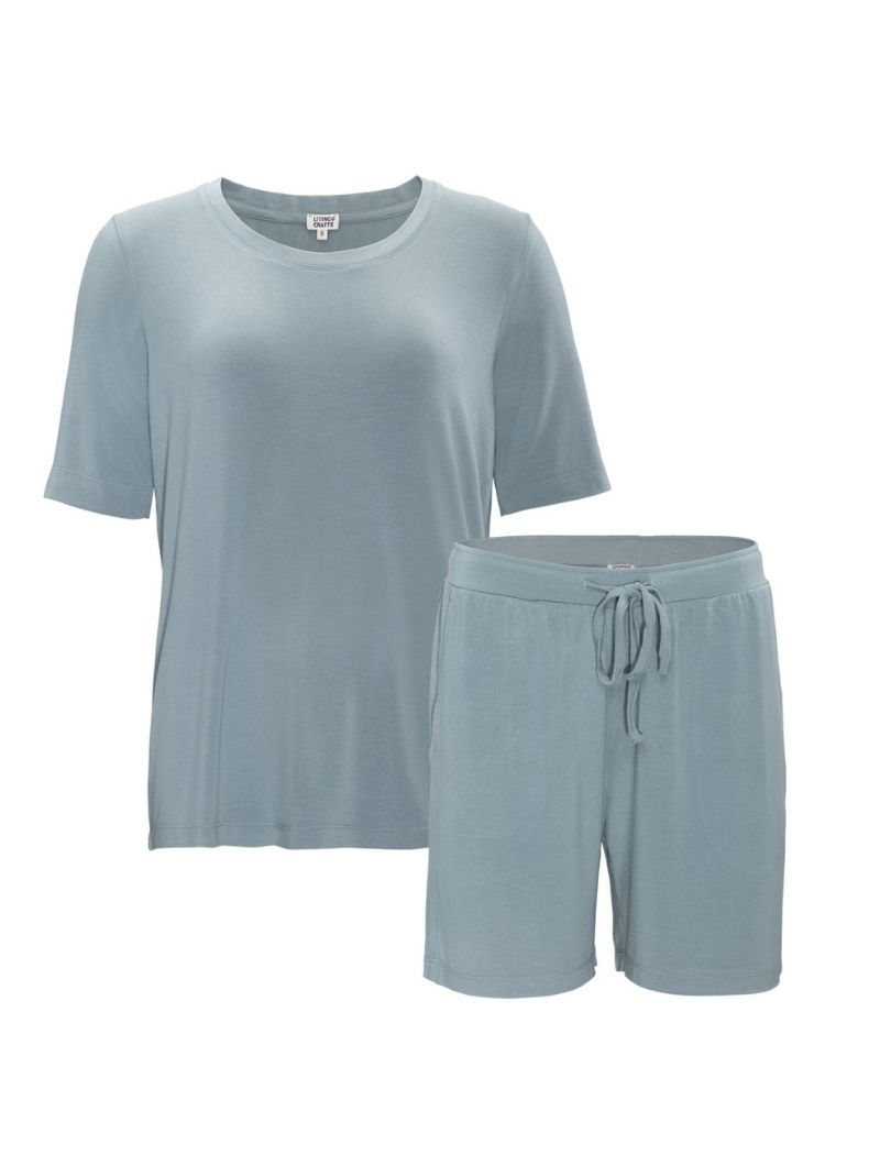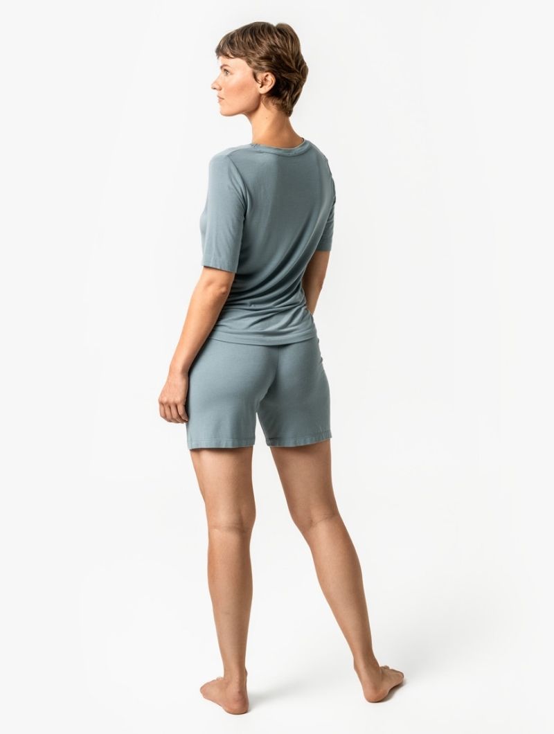 El pantalón corto incorpora cintura elástica con cordón ajustable y bolsillos laterales, un detalle práctico poco habitual en este tipo de prendas. El conjunto está realizado en color azul grisáceo suave, un tono sereno y fácil de llevar.