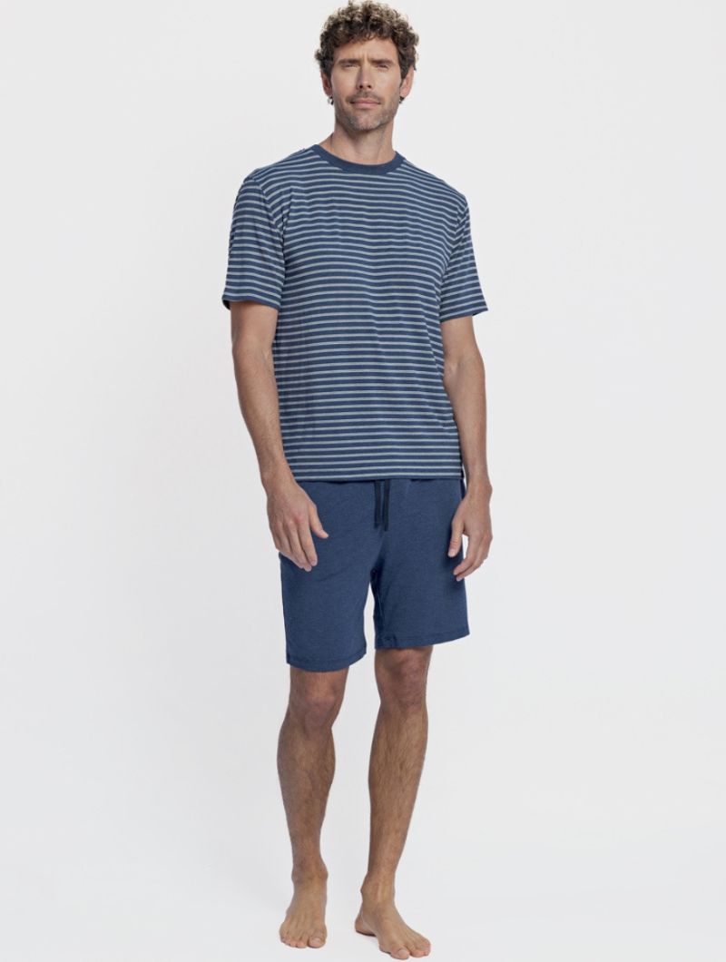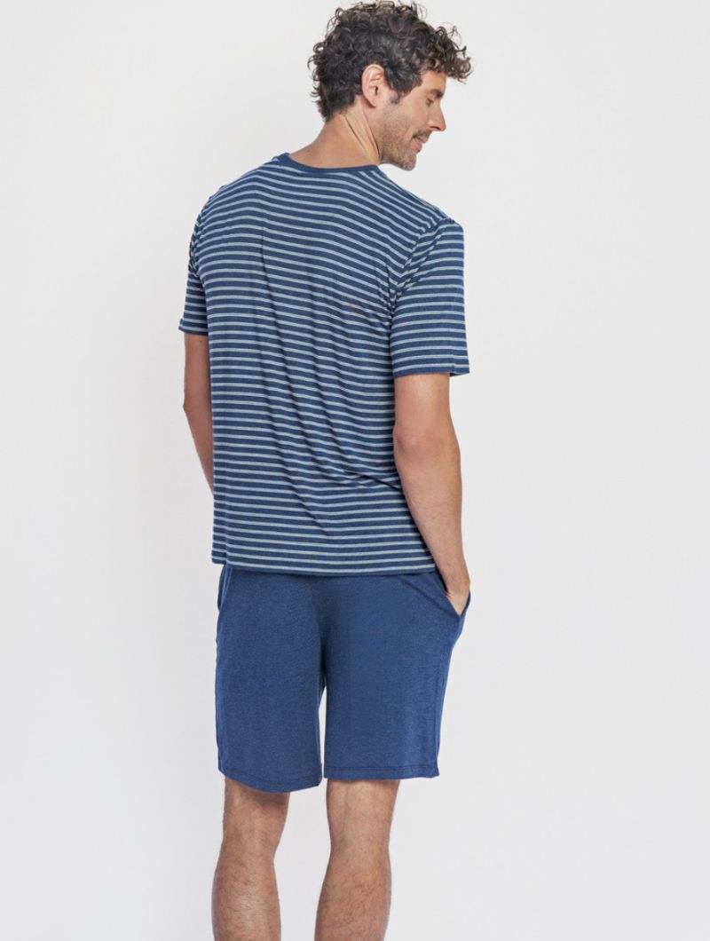 Conjunto de pijama corto para hombre pensado para el descanso en primavera y verano. El tejido de modal ofrece un tacto especialmente suave y un comportamiento muy fresco sobre la piel, incluso en noches calurosas. Su ligereza y transpirabilidad ayudan a mantener una sensación agradable durante toda la noche, sin renunciar a libertad de movimiento.