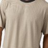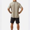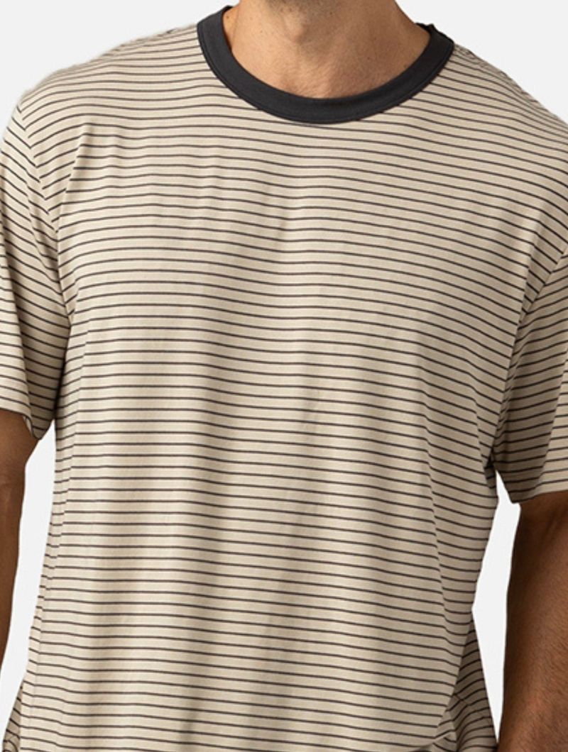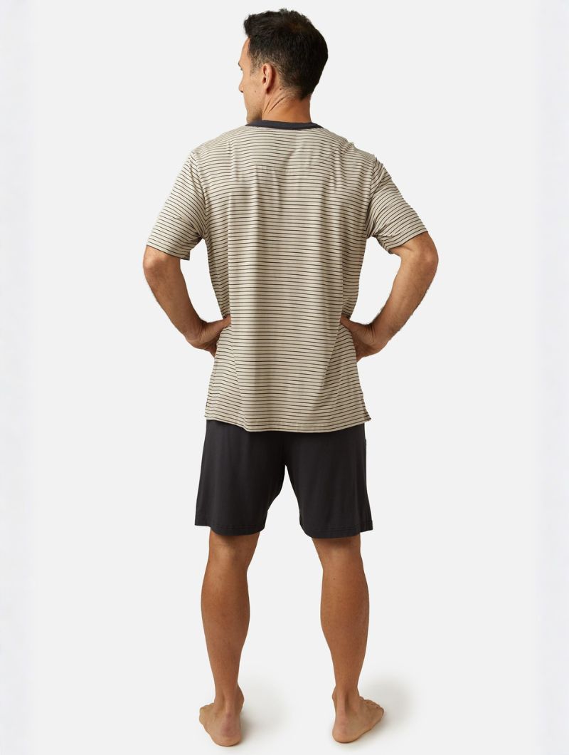Pijama corto para hombre en una combinación equilibrada de tonos plomo y beige. La camiseta de manga corta presenta un diseño de rayas horizontales muy finas, con cuello redondo en contraste que aporta definición sin romper la sobriedad del conjunto. El pantalón corto, en color oscuro liso, completa el diseño con una estética discreta y bien proporcionada.
