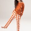 El conjunto se compone de dos piezas: una camiseta lisa con cuello redondo y puños de canalé fino, y un pantalón con diseño de cuadros naranja, cintura elástica y banda interior. El color naranja le da un toque alegre y energético al pijama, y el corte ligeramente entallado te favorece y te hace sentir cómoda y guapa.