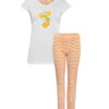 Colores: Camiseta blanca con motivo de naranjas y pantalón a rayas naranja/blanco.