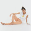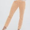 Es un conjunto formado por una camiseta blanca y unos pantalones largos a rayas de color naranja. Ambas prendas están hechas de algodón orgánico 100%, un tejido natural que mima tu piel y el planeta.