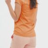 La camiseta de manga corta es de color liso, a elegir entre naranja o azul. Tiene un corte femenino y relajado que te deja respirar. El borde inferior y las mangas están reforzados con un dobladillo doble para mayor durabilidad. El estampado de cuadros alrededor de la nuca le da un toque sofisticado y original.