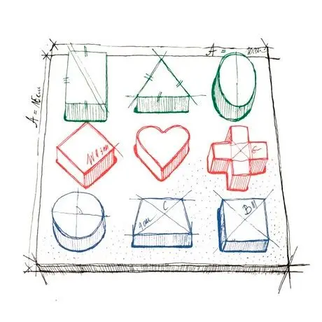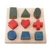 El puzzle geométrico consta de una base de madera natural con hendiduras sobre las que encajar las 9 piezas de madera de diferentes formas y colores.