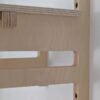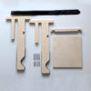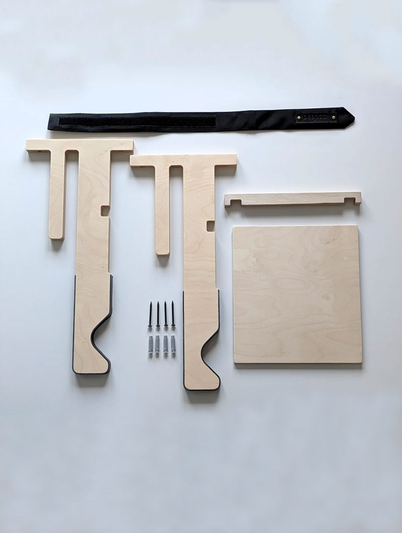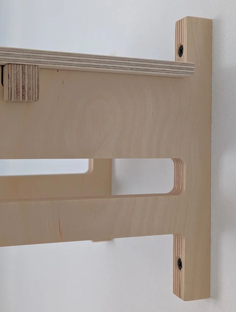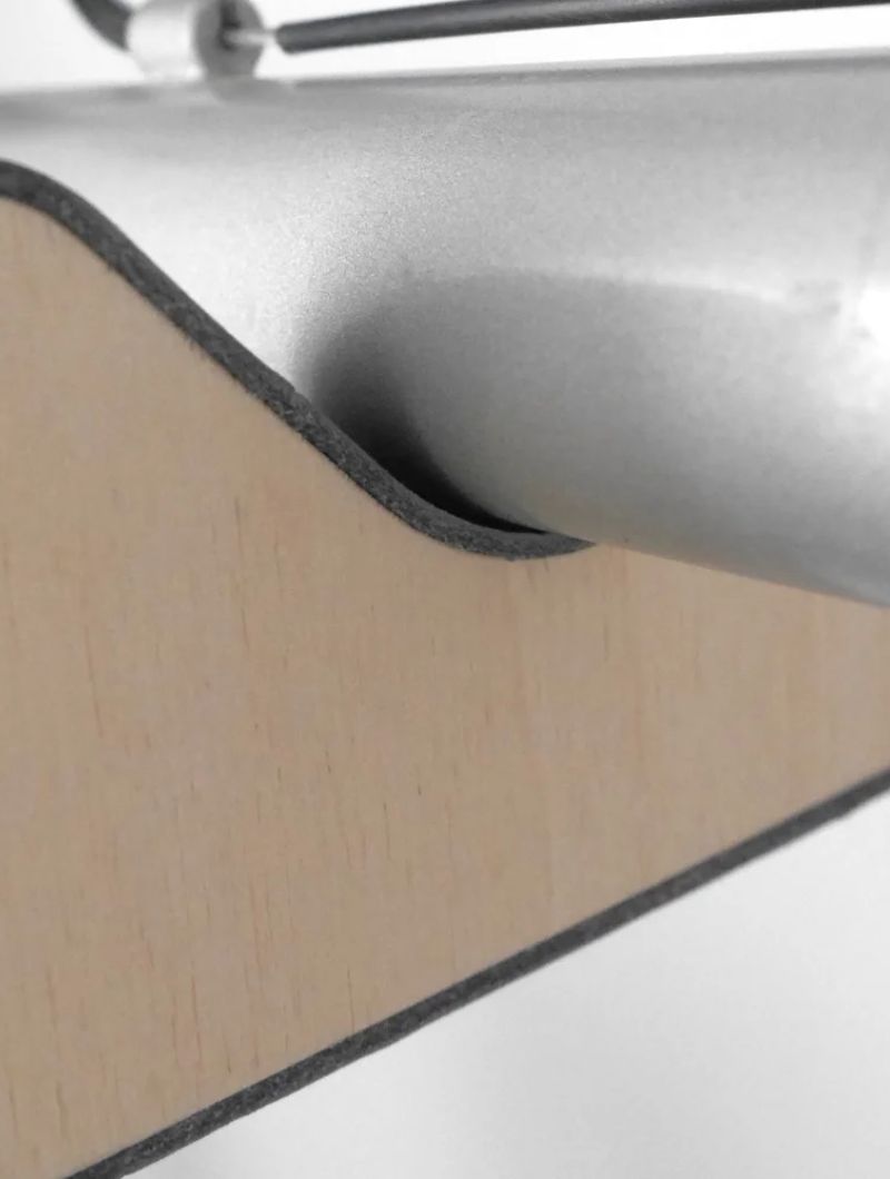 Fabricado con cuatro piezas de contrachapado de abedul sin tratar, con la zona de apoyo recubierta de piel de vaquetilla natural para proteger el cuadro. La madera no necesita mantenimiento: con el uso gana calidez y carácter, y basta pasarle un paño seco si se quiere mantener su tono.