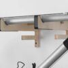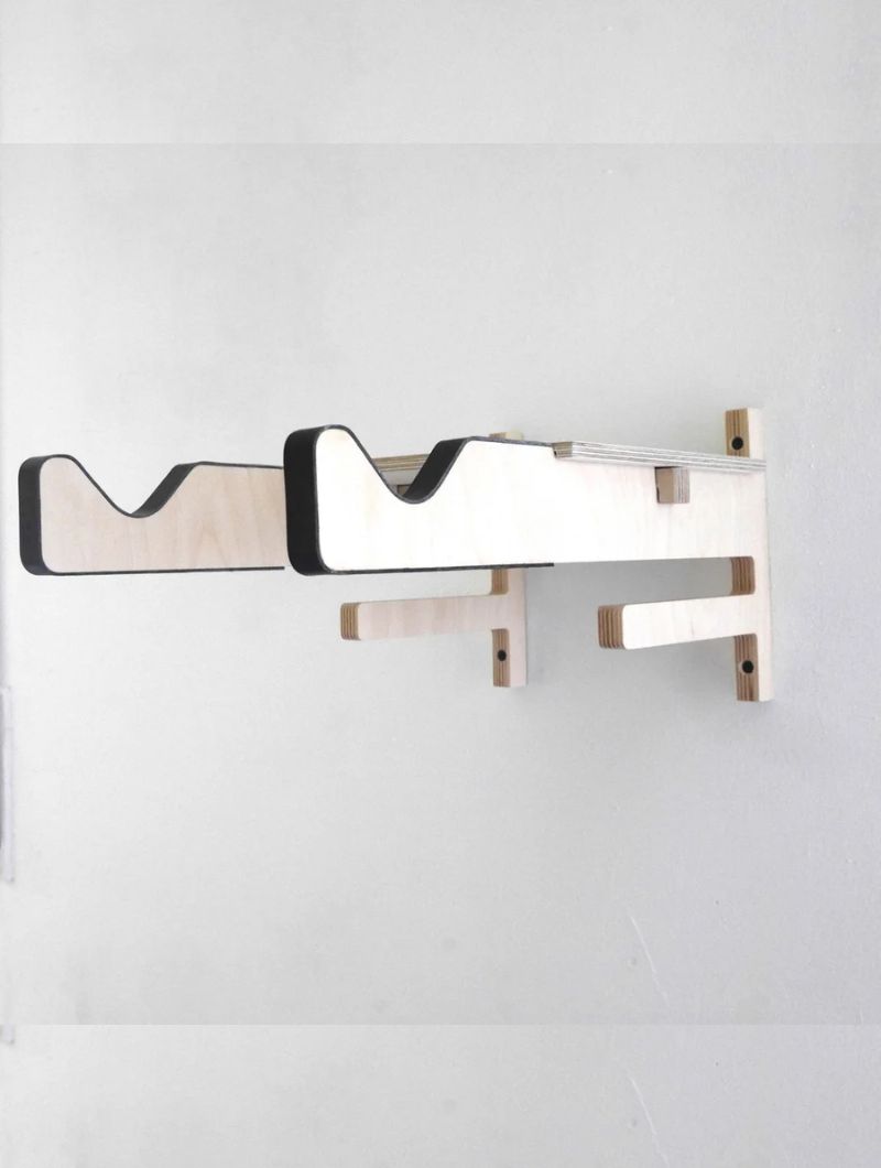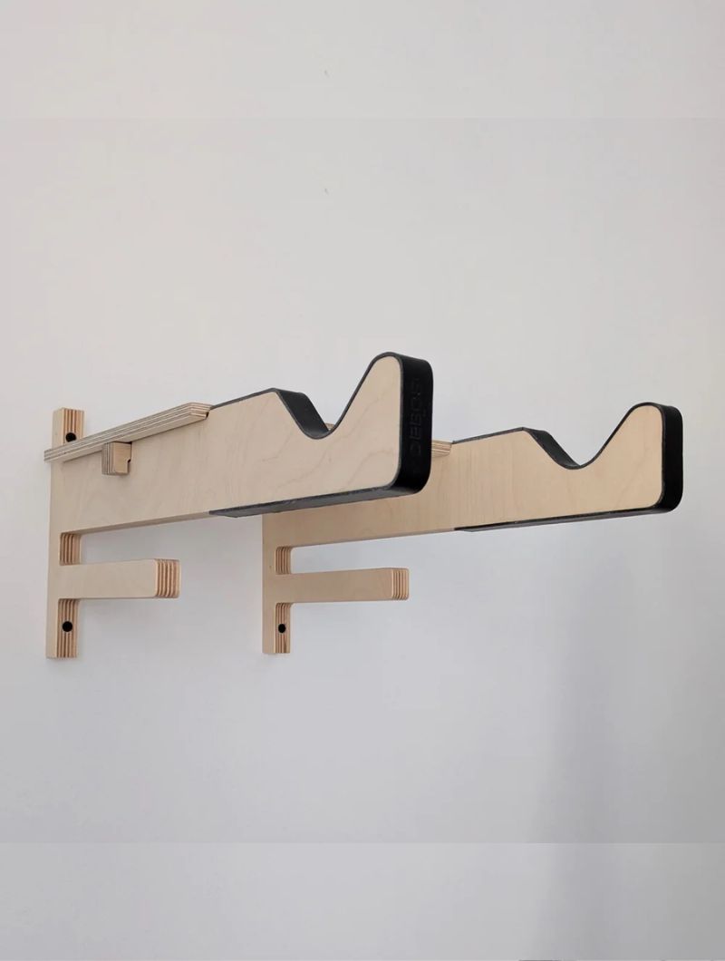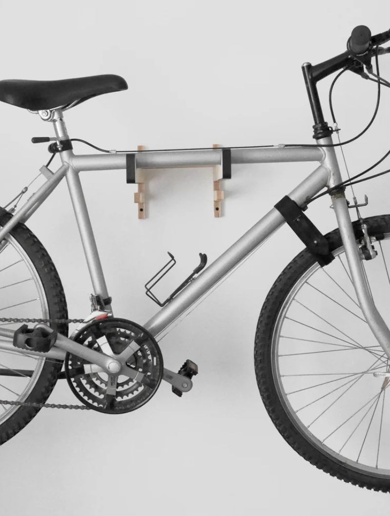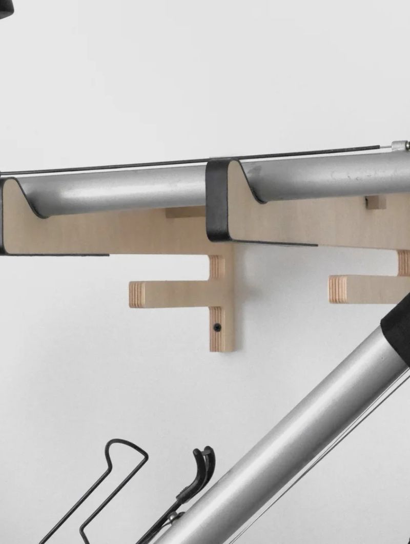 Soporte de pared diseñado para colgar la bicicleta y liberar espacio sin renunciar al estilo. Incluye una bandeja superior para dejar casco, gafas o guantes, y dos colgadores inferiores donde organizar los accesorios del día a día.