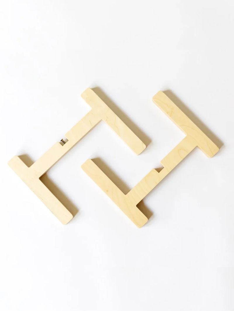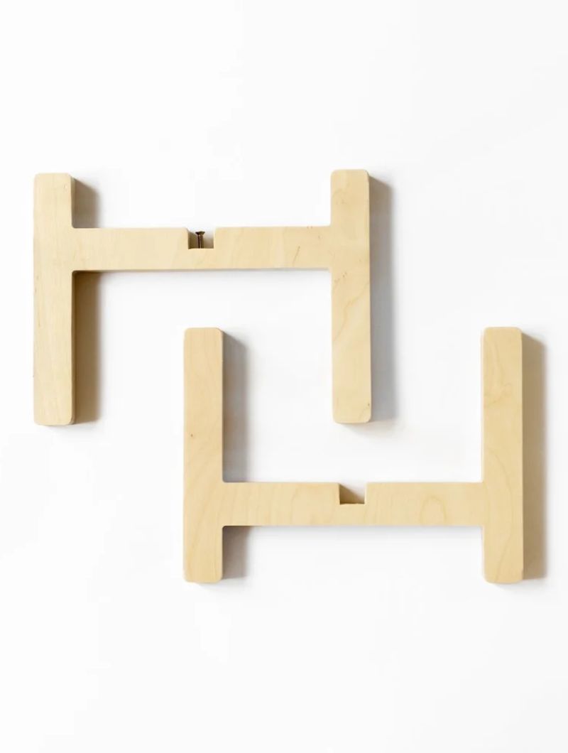 Fabricado en contrachapado de abedul sin tratar, con dos piezas gruesas de 18 mm unidas mediante un tornillo pasante. La madera envejece bien: con el tiempo gana calidez y puede lijarse suavemente si se desea mantener el tono original.