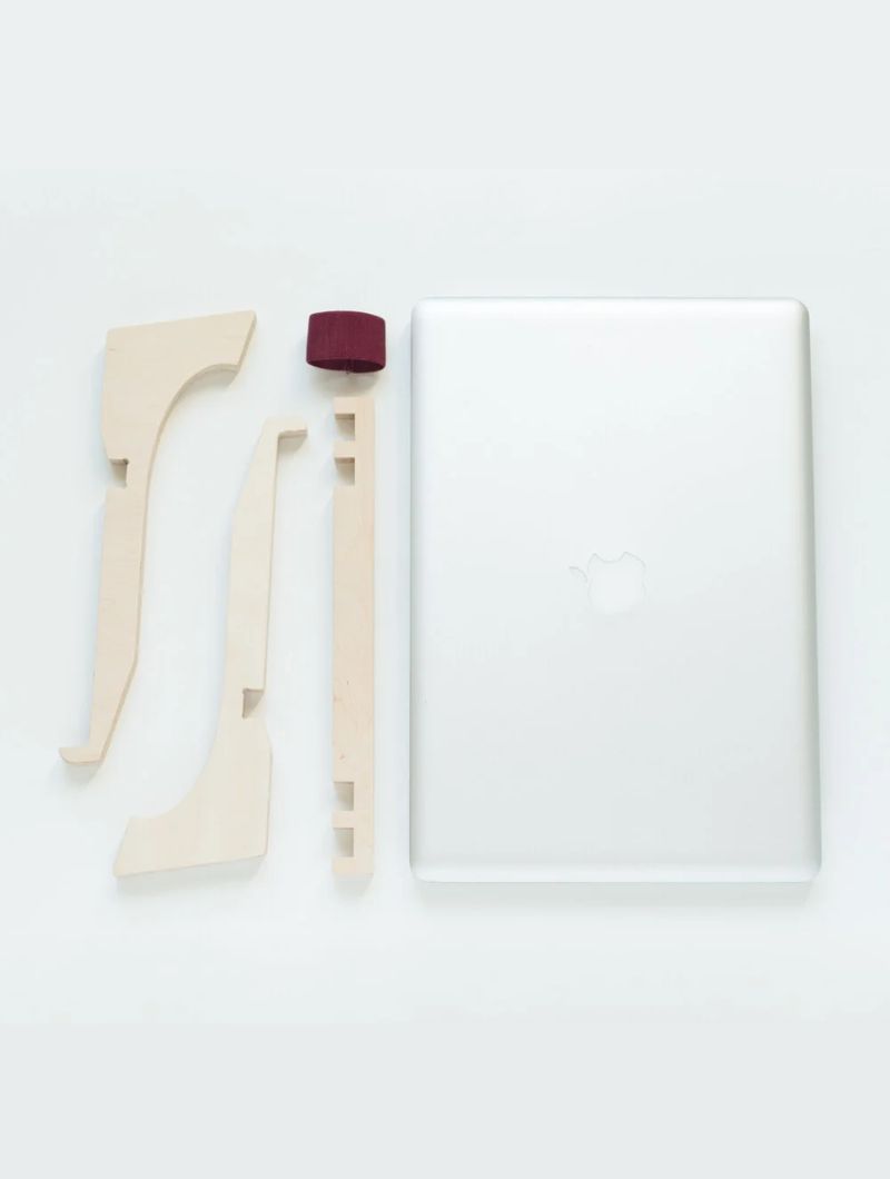 Los topes frontales evitan que el dispositivo se deslice y la pieza central cuenta con dos posiciones diferentes para adaptarse a portátiles de distintos tamaños. Se monta y desmonta en segundos, y apenas ocupa espacio al guardarlo o transportarlo.
