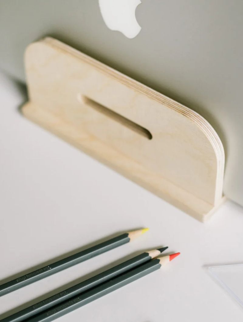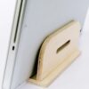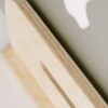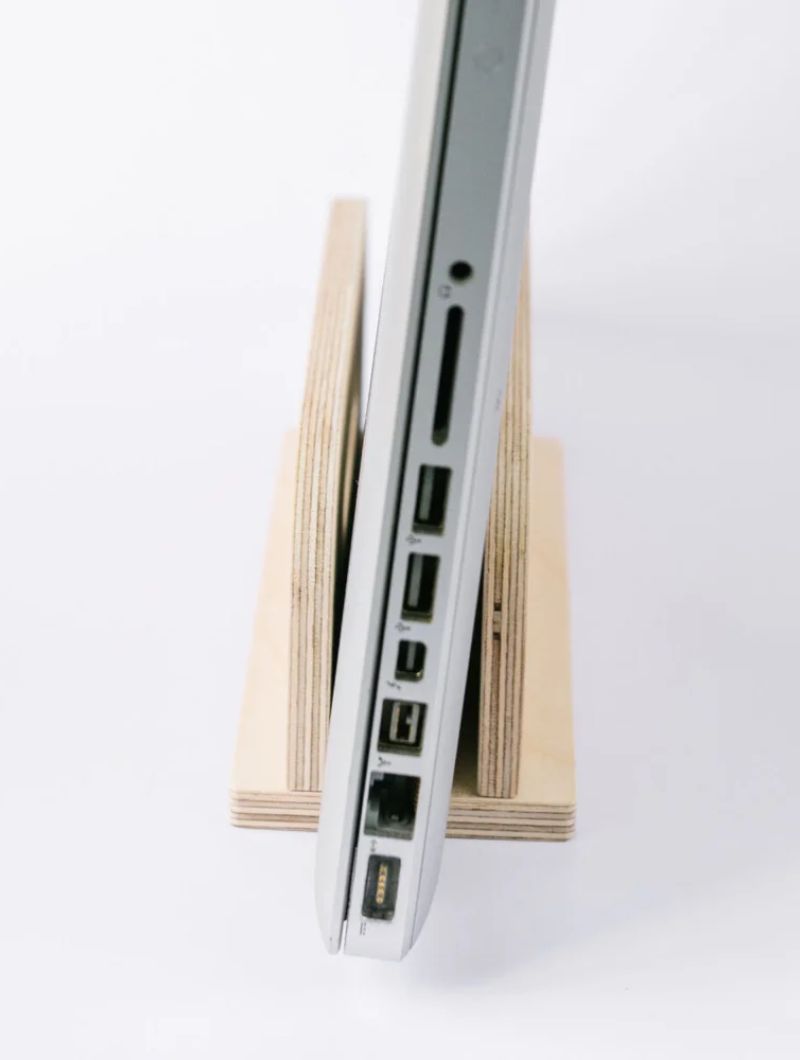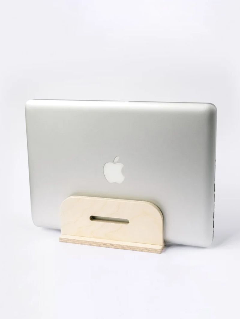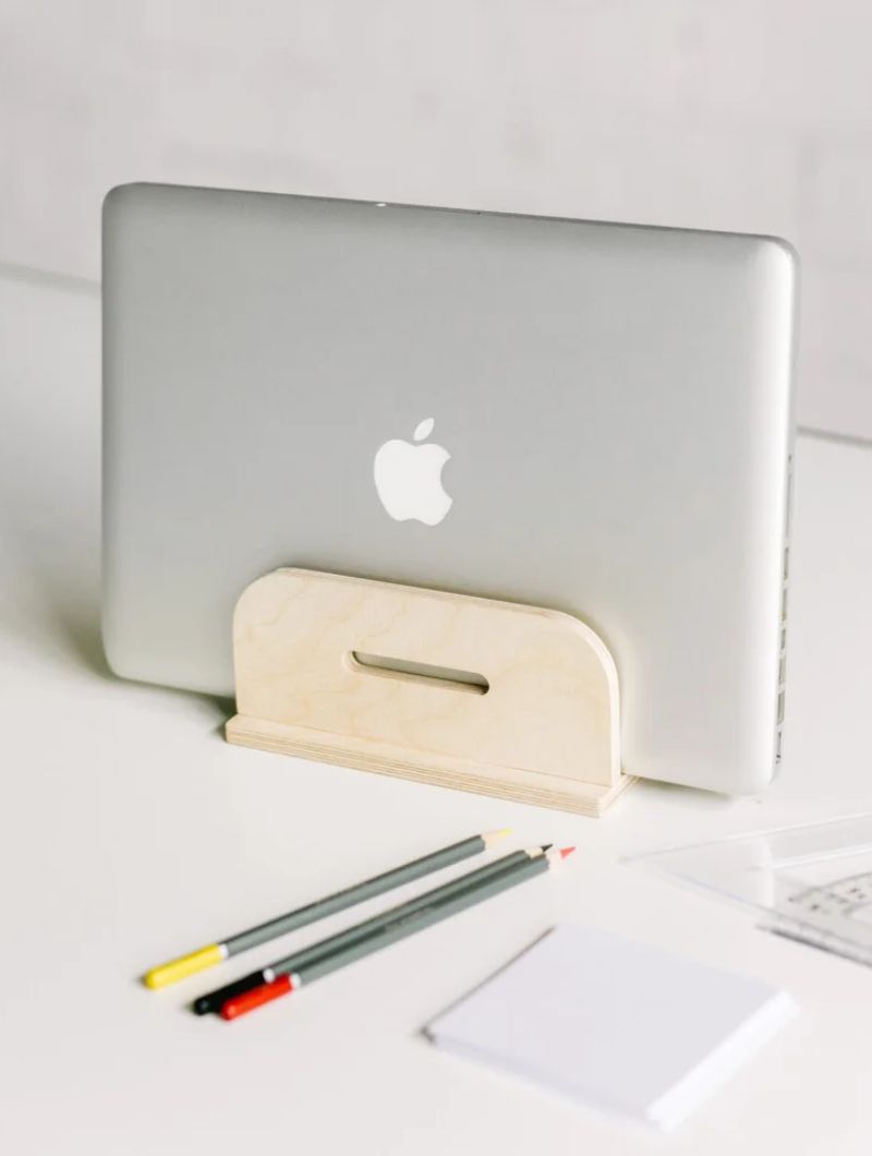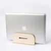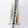 Soporte de madera diseñado para mantener el portátil en posición vertical y dejar el escritorio despejado. Permite guardar el ordenador mientras se carga, y su ranura de 3 cm de ancho ofrece espacio suficiente para la mayoría de modelos, incluso para colocar dos equipos finos a la vez.