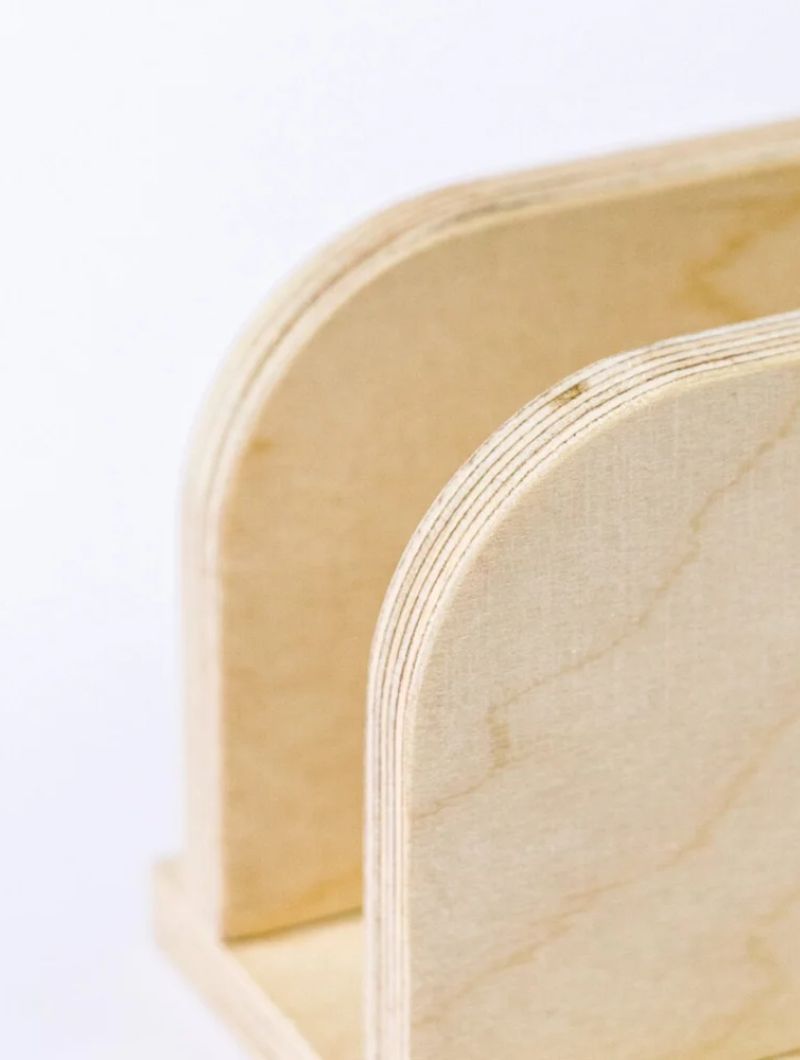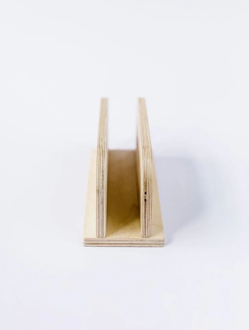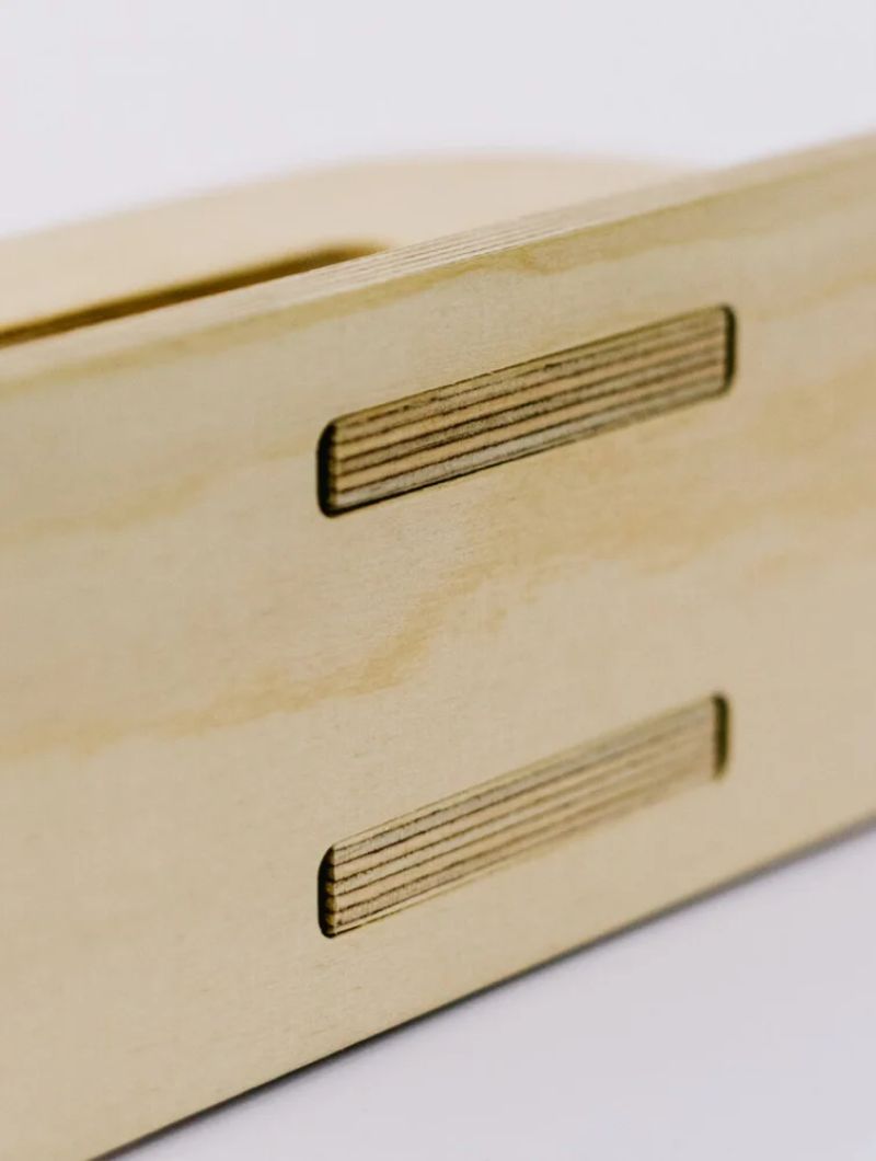 Fabricado en contrachapado de abedul natural, sin tratar, con tres piezas ensambladas de 9 mm de grosor. La madera gana calidez con el tiempo, aunque puede lijarse suavemente si se desea mantener su tono original.