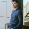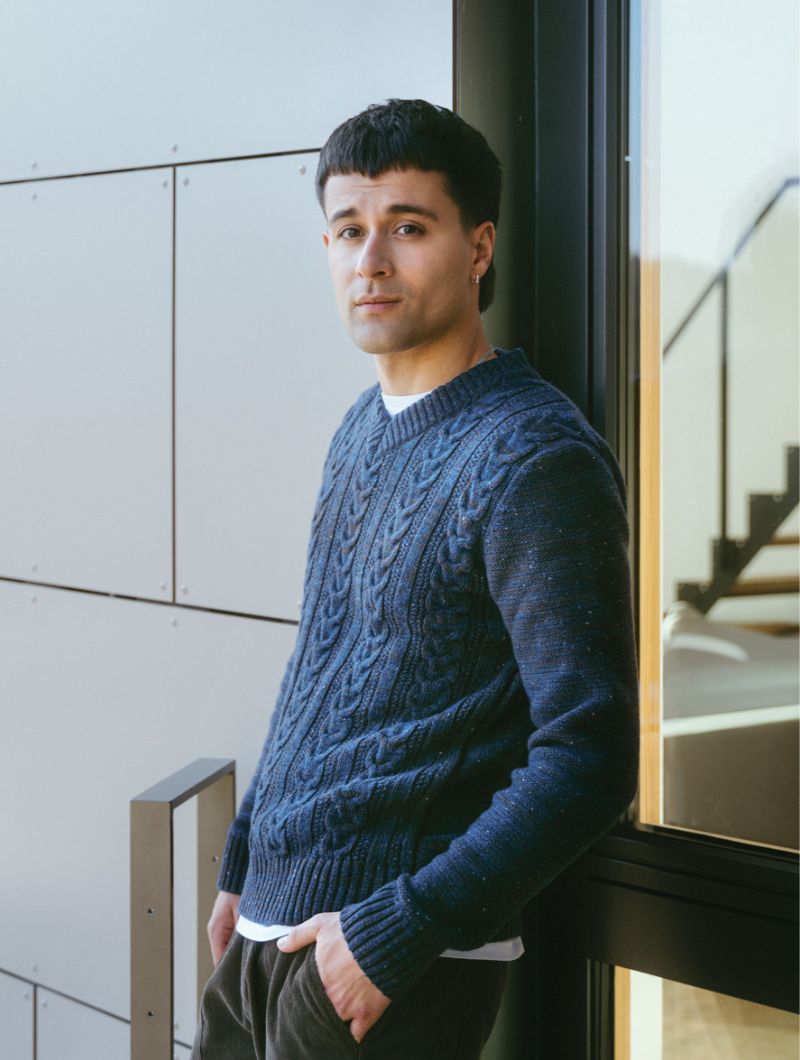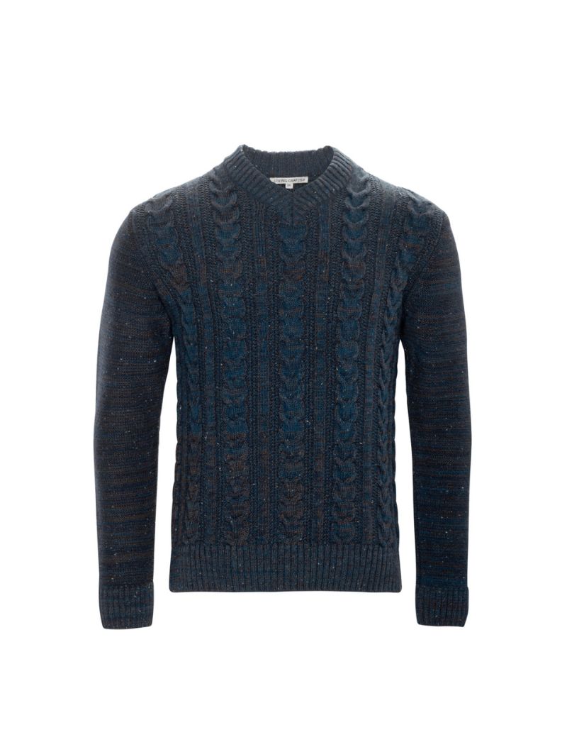 Su punto trenzado en la parte frontal, junto al jaspeado de hilos mouliné, crea un efecto visual único lleno de matices.