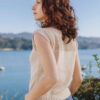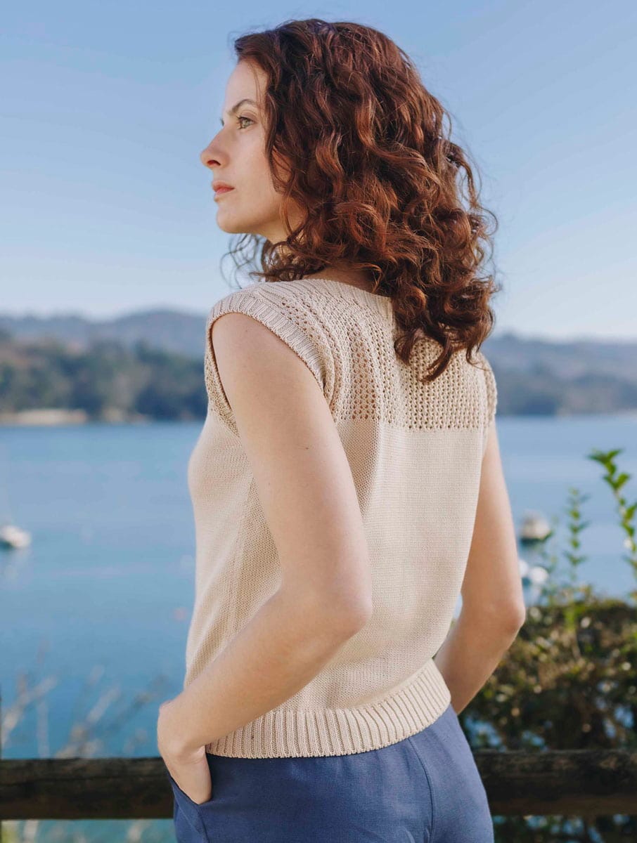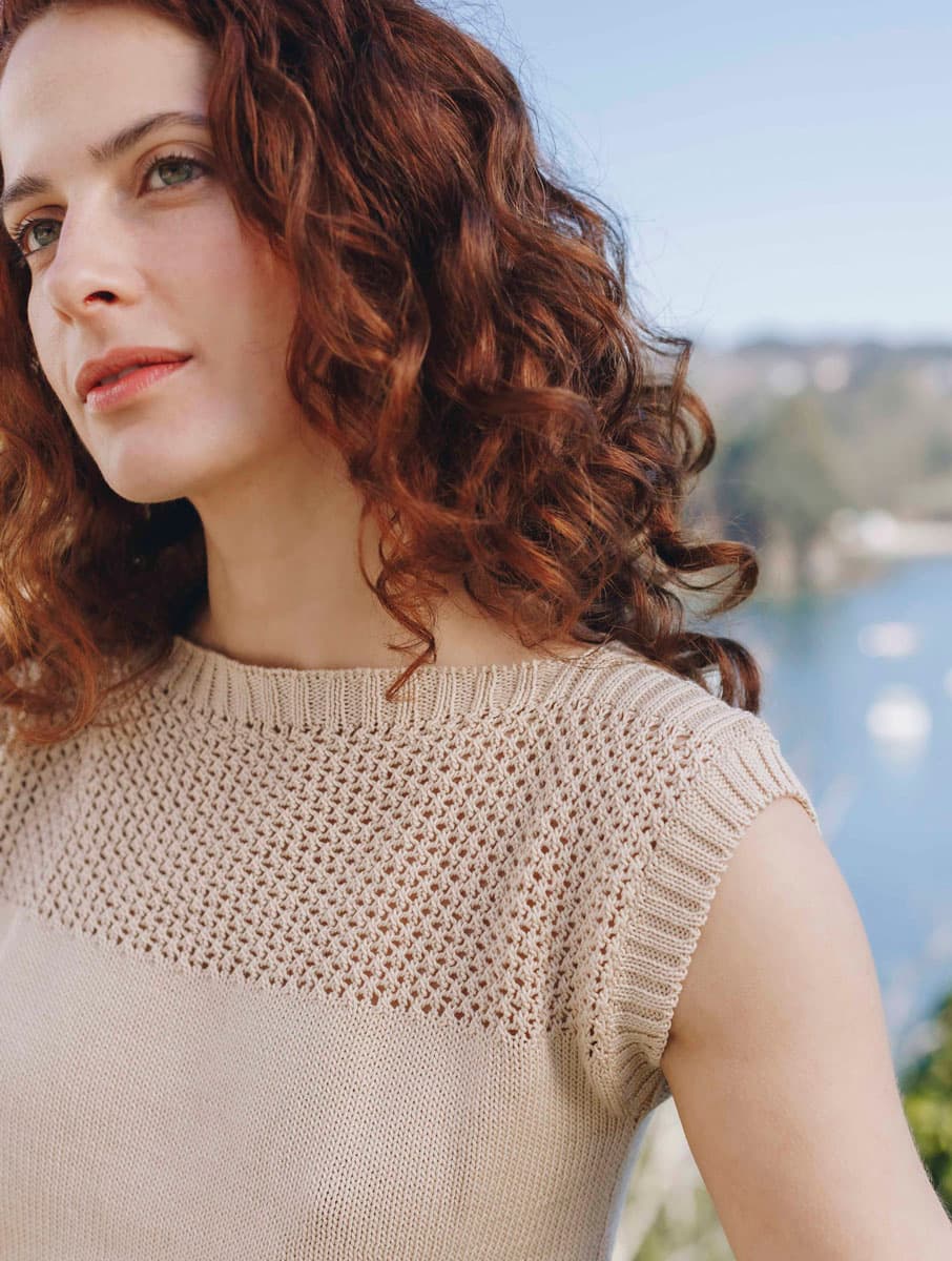 Su escote barco y ribetes acanalados en hombros y bajo realzan la prenda, dándole un toque de elegancia discreta. Inspirado en la belleza de las redes de pesca, su diseño vintage se integra perfectamente tanto en looks casuales como formales.