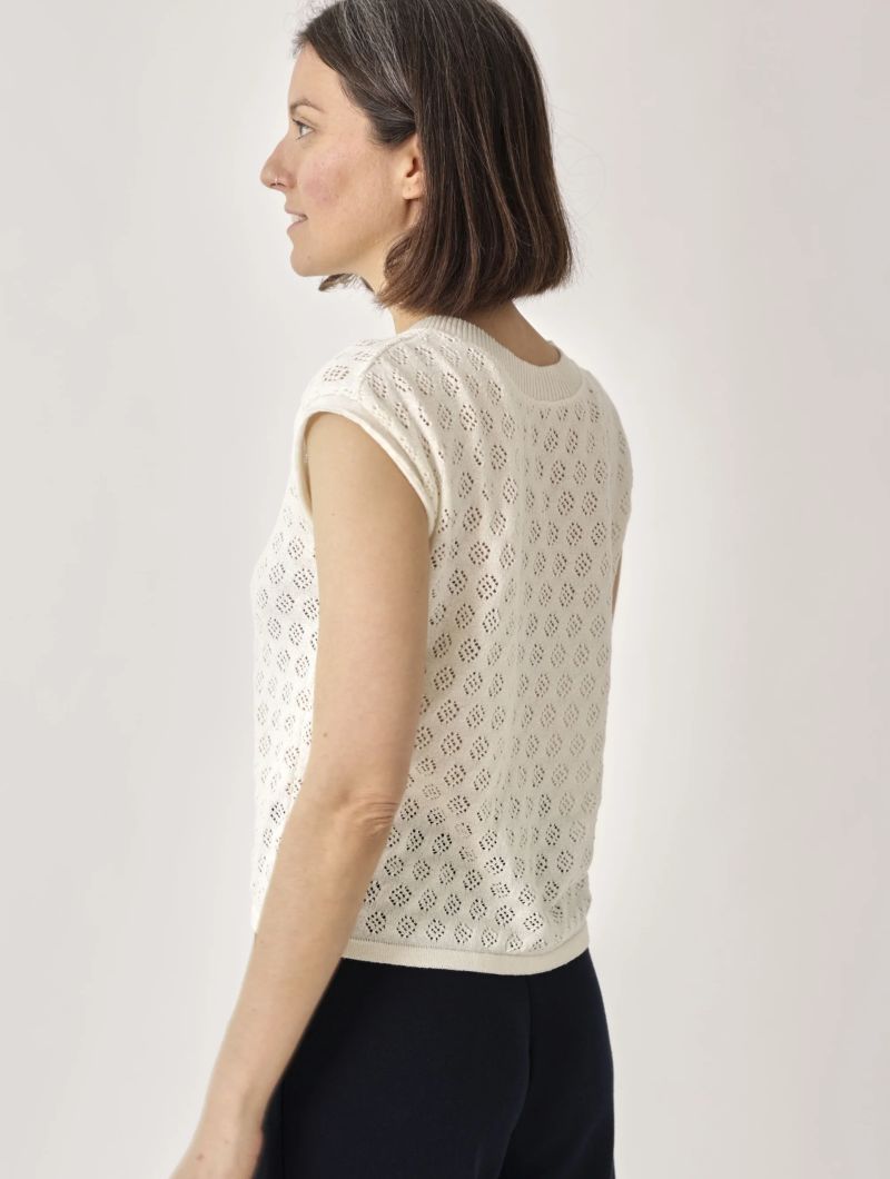 Top de punto calado con patrón geométrico repetido que genera un juego de transparencias sutil y uniforme en toda la prenda. El dibujo, construido a partir de pequeñas formas abiertas, aporta textura sin recargar y deja entrever ligeramente la piel, reforzando su carácter ligero y veraniego.