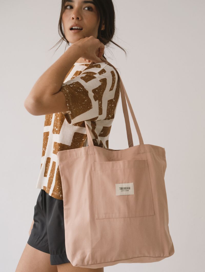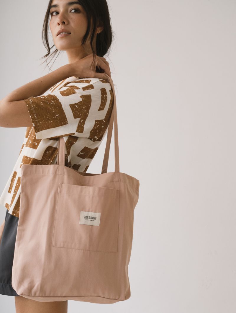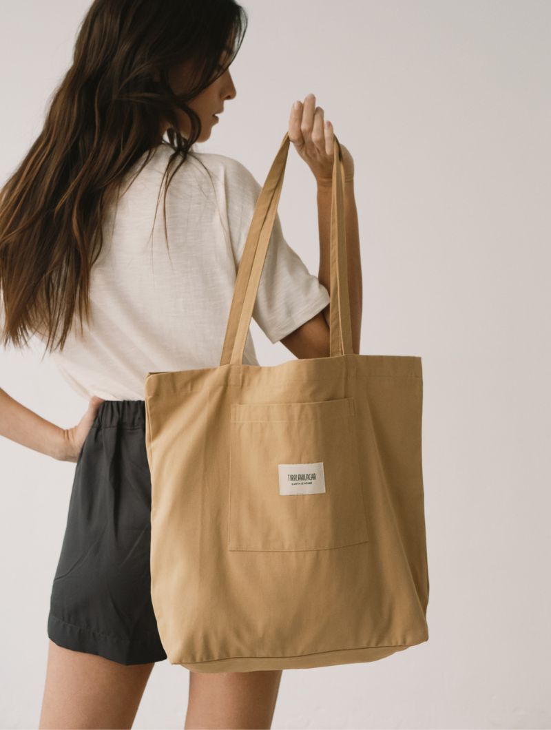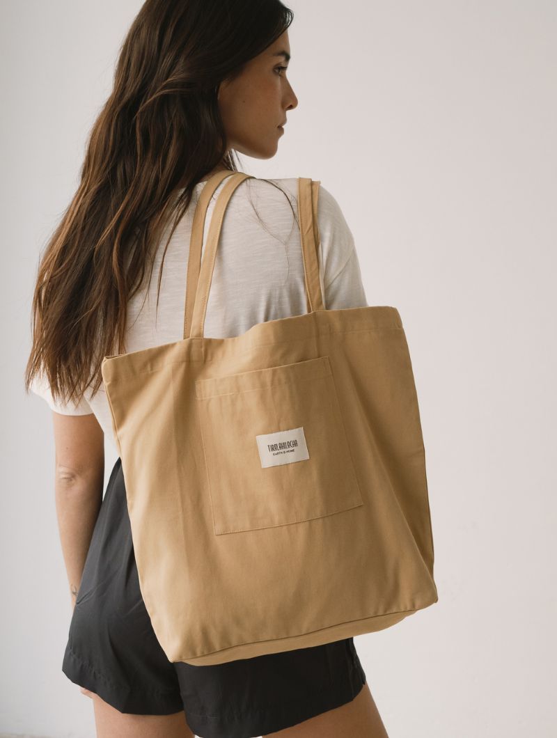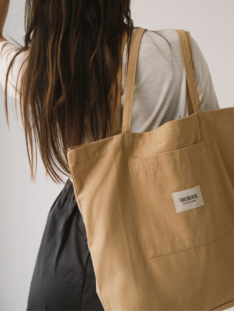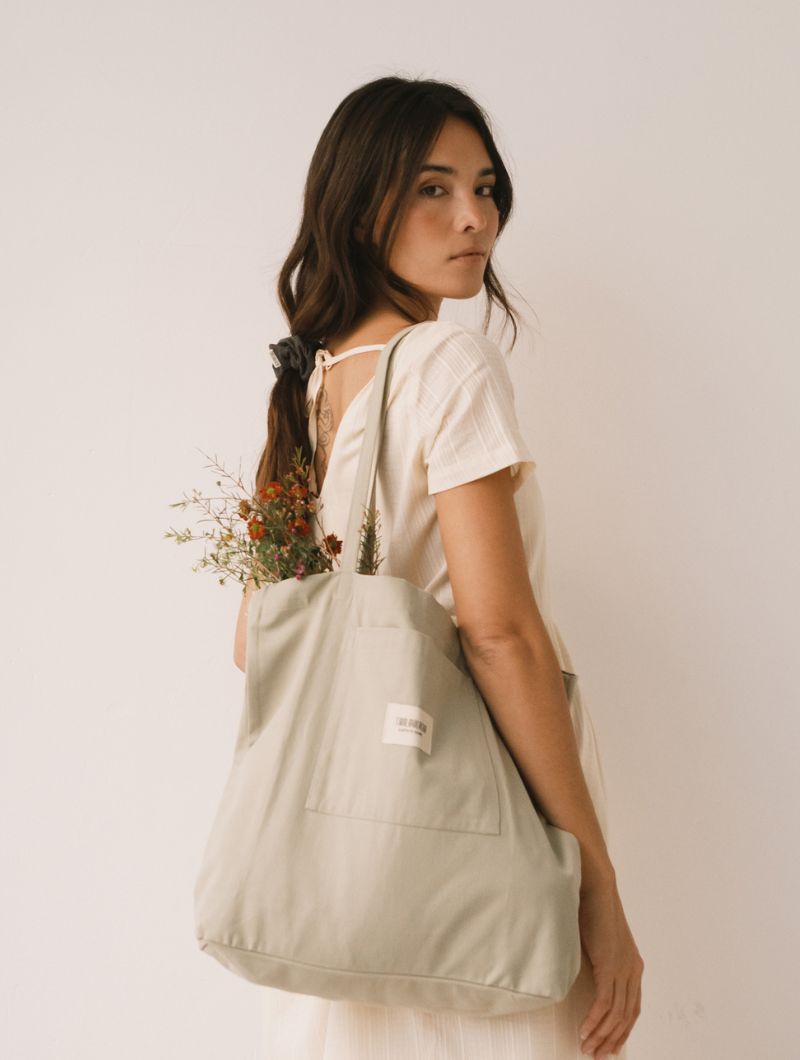 Tote bag de formato amplio con estructura resistente y asas largas para llevar cómodamente al hombro. El diseño es limpio, sin rigideces, con una caída natural que se adapta al uso diario.