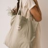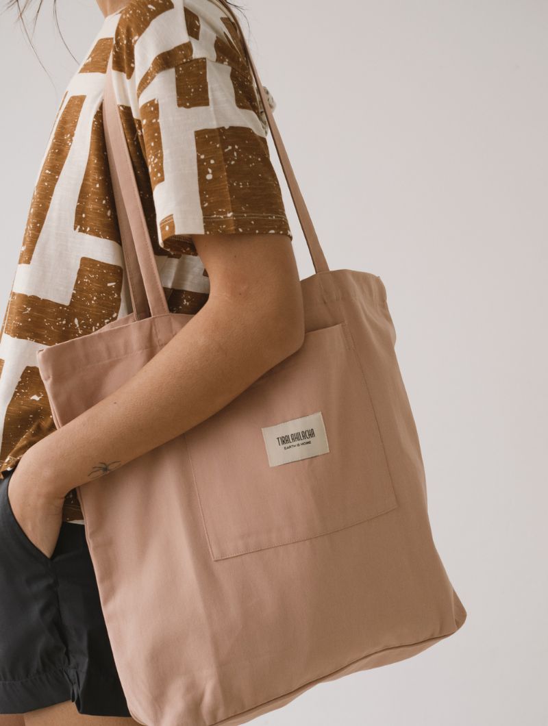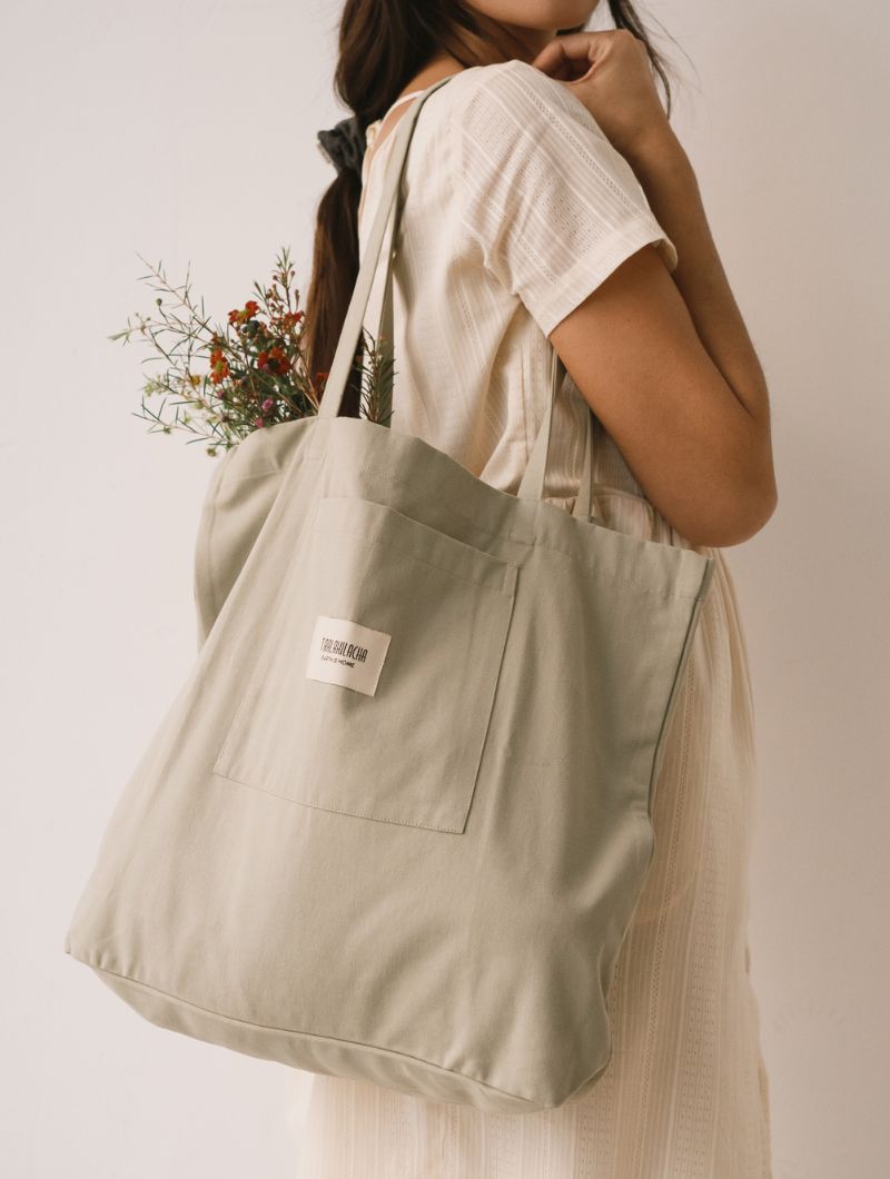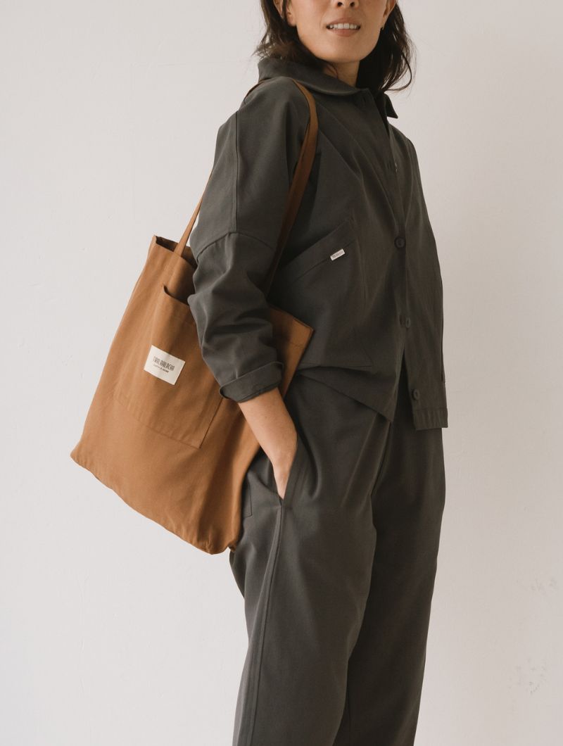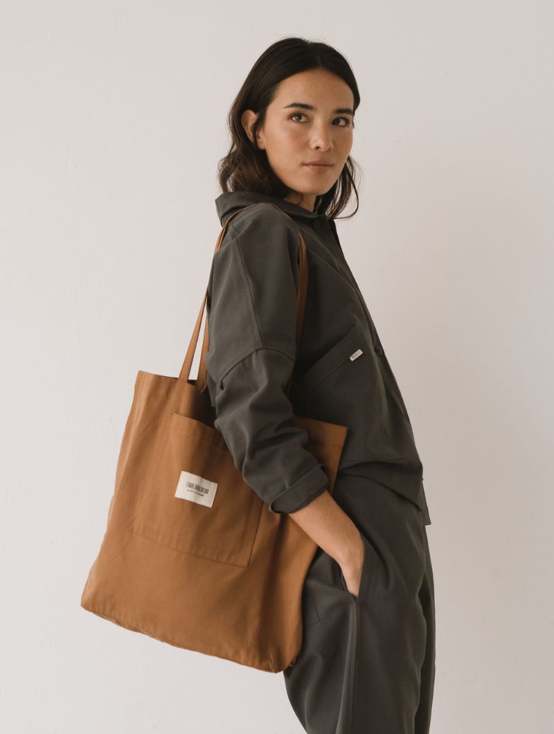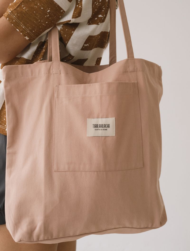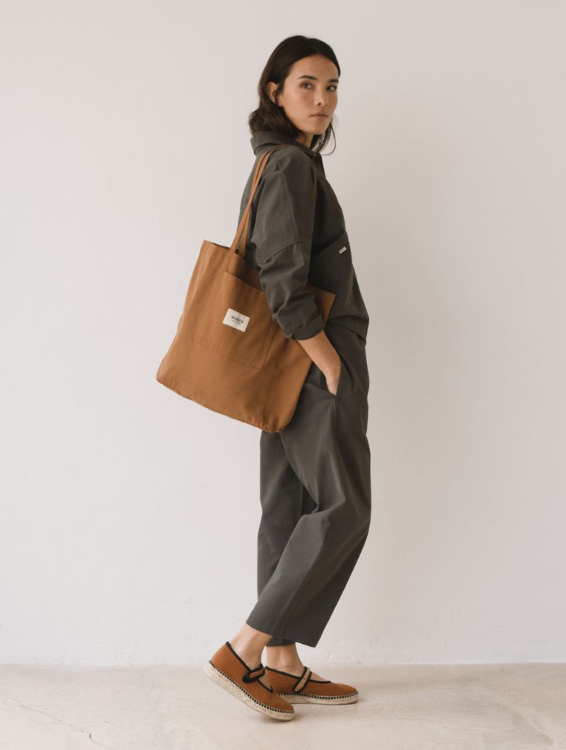 Tote bag de formato amplio con estructura resistente y asas largas para llevar cómodamente al hombro. El diseño es limpio, sin rigideces, con una caída natural que se adapta al uso diario.