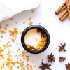 La vela está decorada con corteza de naranja, canela y anís estrellado.