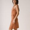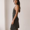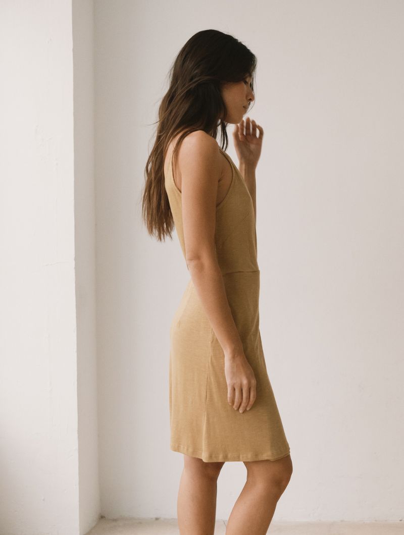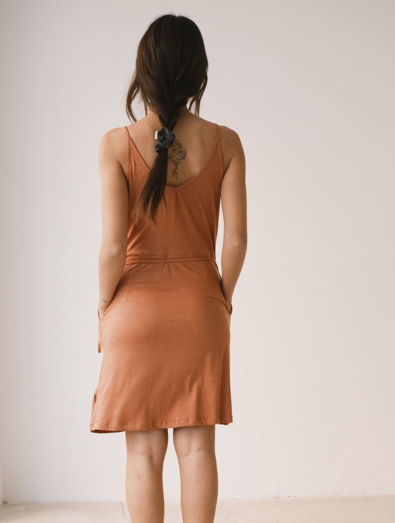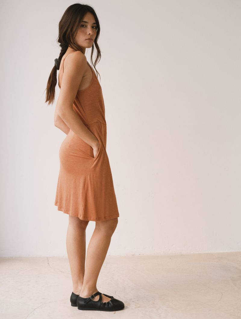 El diseño incorpora una ligera abertura lateral generada por el cruce del tejido, aportando libertad al caminar y un aire desenfadado. La espalda queda más limpia, con los tirantes finos aportando ligereza visual. Cuenta con prácticos bolsillos laterales ocultos.