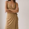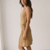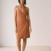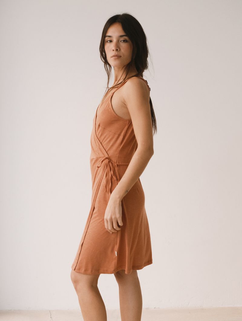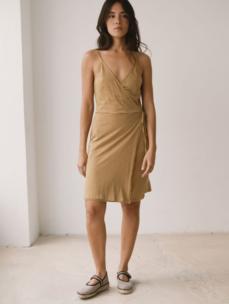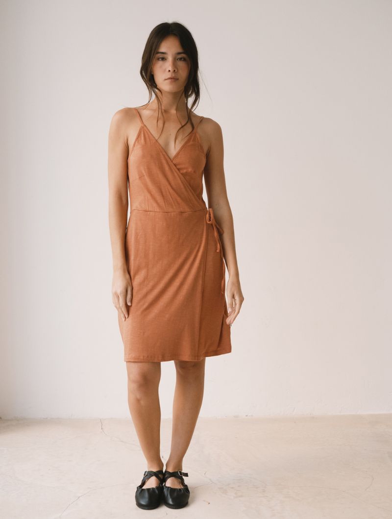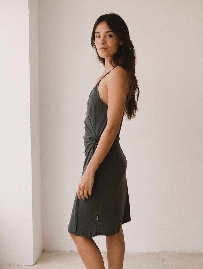 Vestido de tirantes finos con escote cruzado en pico y cierre lateral mediante lazada, que permite ajustar la prenda al cuerpo con naturalidad. Presenta un largo por encima de la rodilla y una caída fluida que acompaña el movimiento sin marcar en exceso.