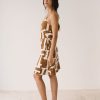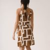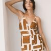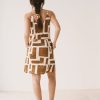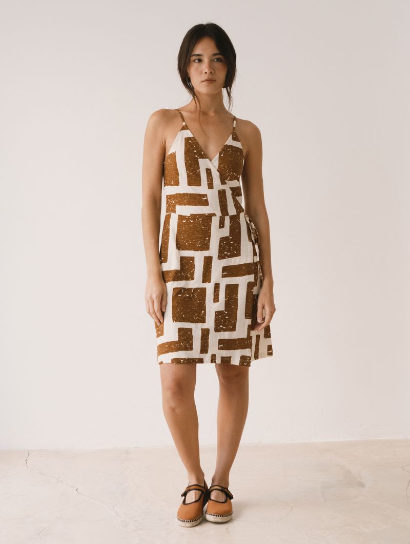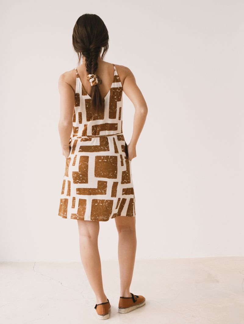 Vestido de tirantes finos con diseño cruzado y estampado geométrico irregular en tonos tierra sobre fondo claro. El cierre lateral mediante lazada permite ajustarlo al cuerpo de forma sencilla, adaptándose con naturalidad a la silueta.