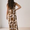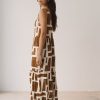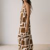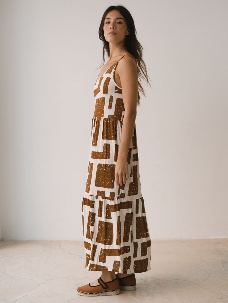 Vestido largo con estampado geométrico en tonos marrones sobre fondo claro marca toda la prenda, con un dibujo irregular que aporta fuerza visual sin resultar recargado.