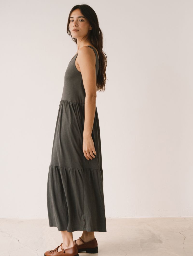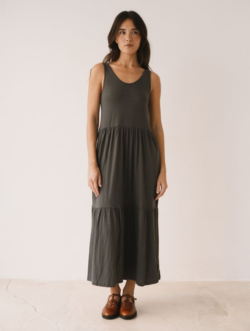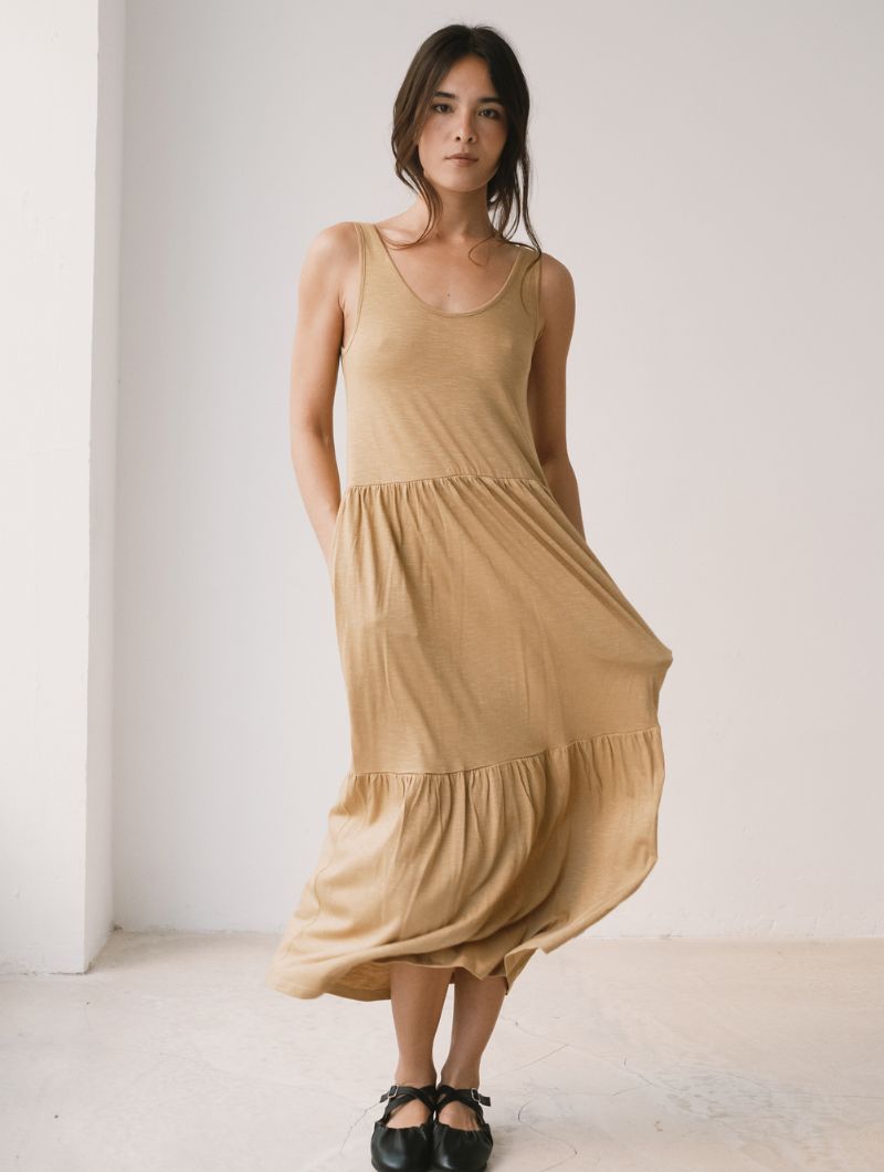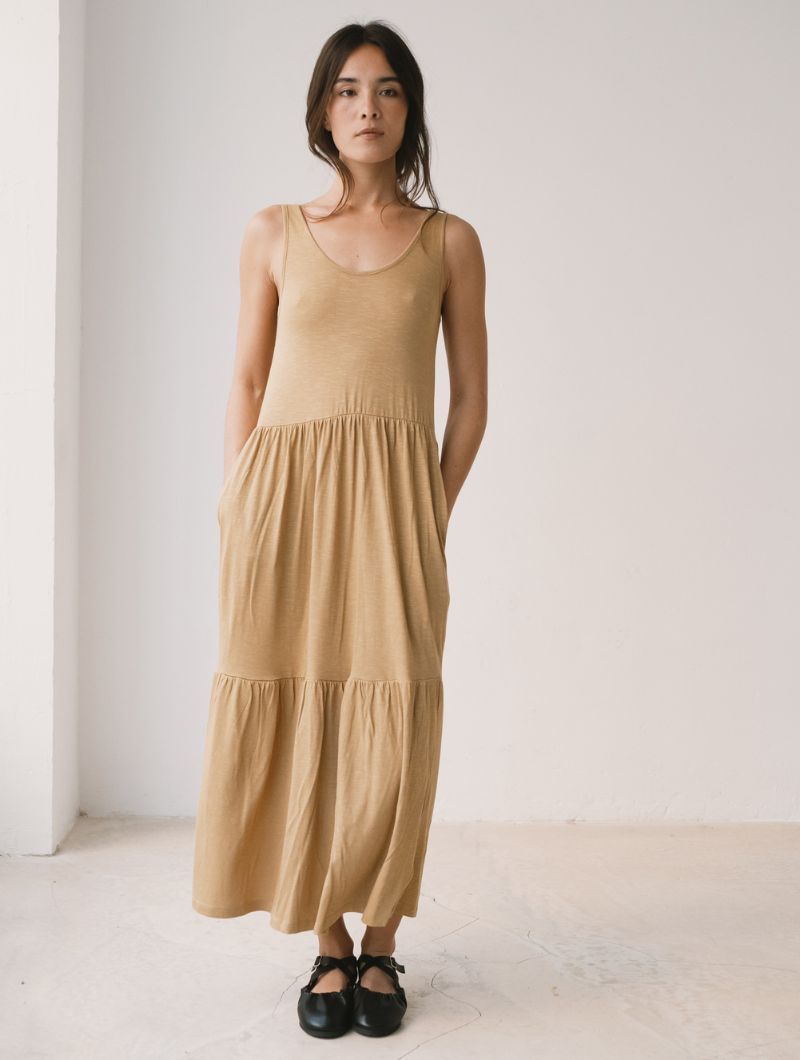 Vestido largo de tirante ancho con parte superior de líneas limpias y caída recta hasta la cintura, desde donde se abre en una falda amplia rematada con un volante inferior que aporta movimiento. El largo llega hasta el tobillo, creando una silueta relajada y continua.