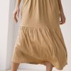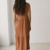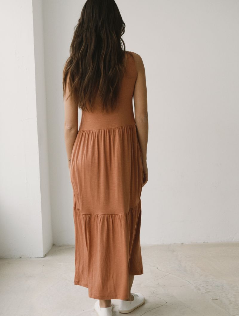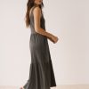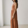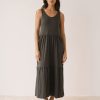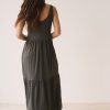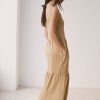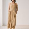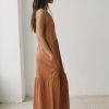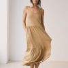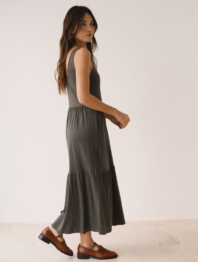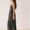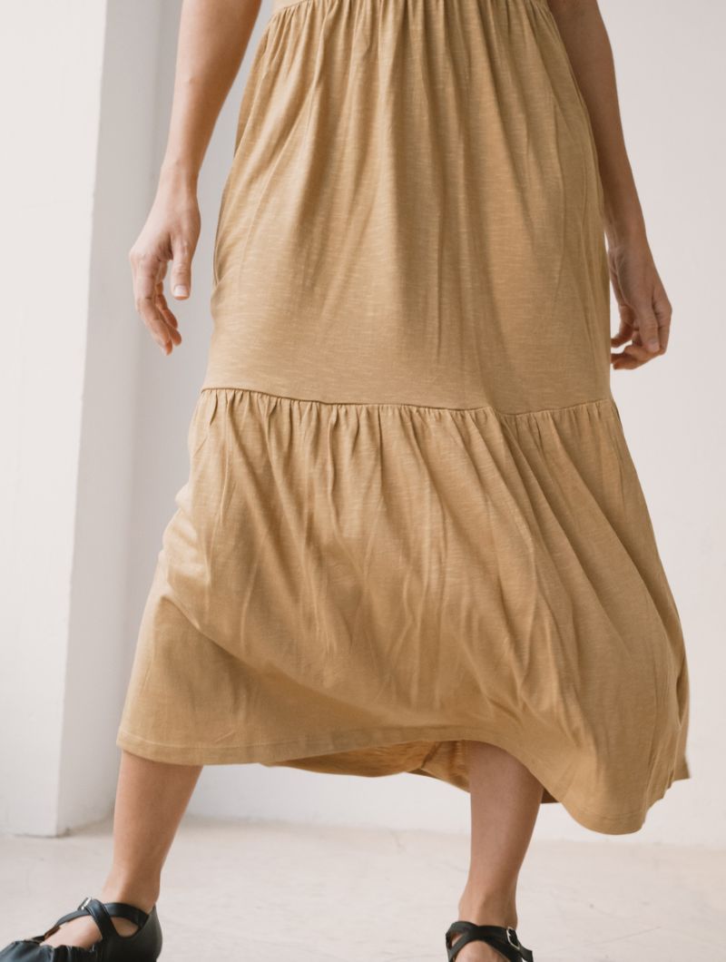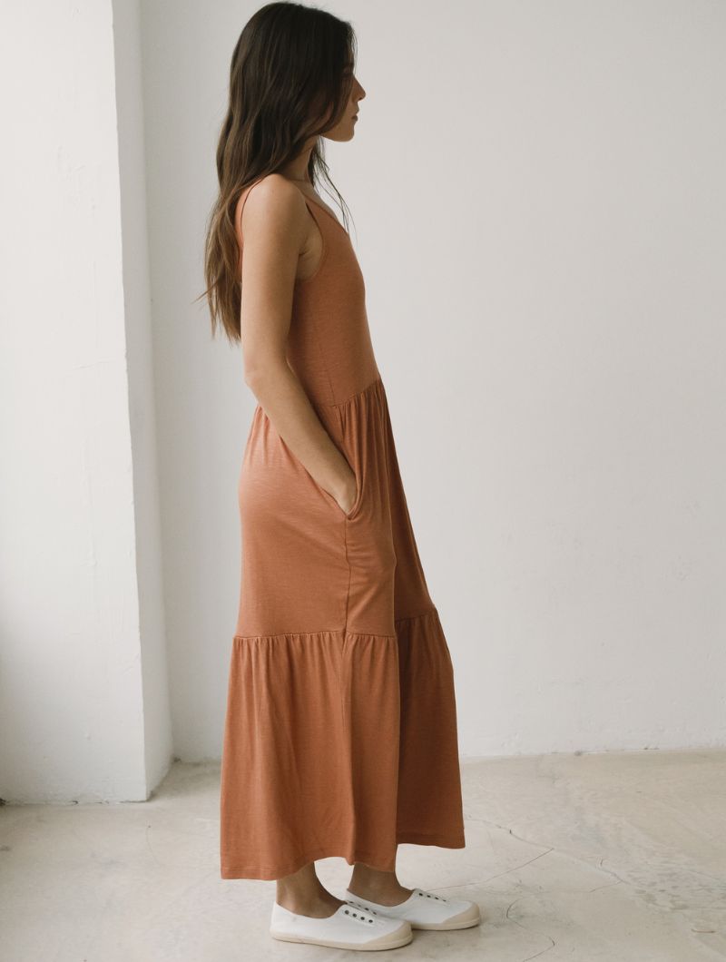 Vestido largo de tirante ancho con parte superior de líneas limpias y caída recta hasta la cintura, desde donde se abre en una falda amplia rematada con un volante inferior que aporta movimiento. El largo llega hasta el tobillo, creando una silueta relajada y continua.