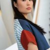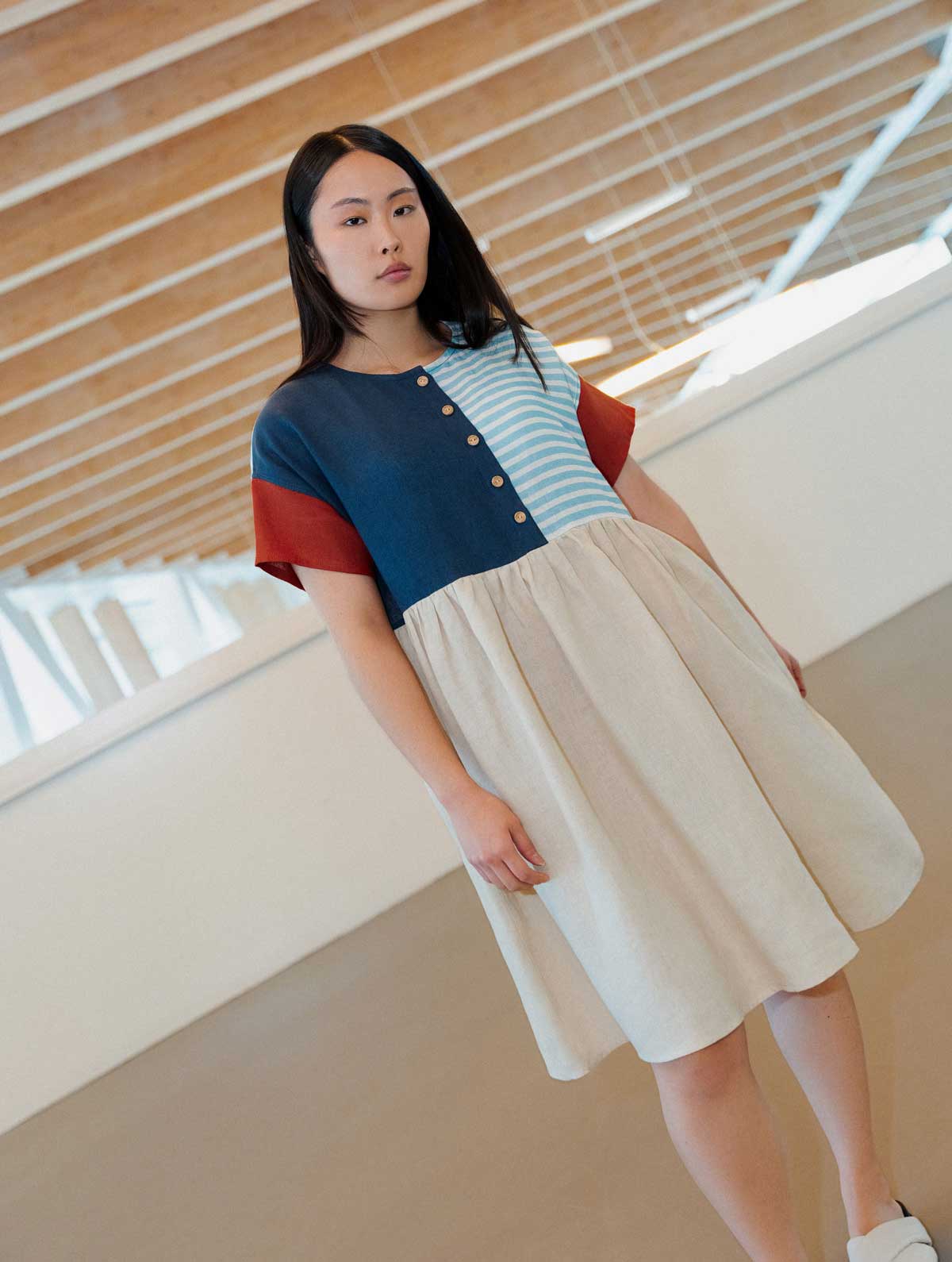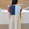 Este vestido de corte amplio presenta manga corta, escote redondo y botonadura frontal. Su diseño en bloques de color lo convierte en una pieza única y especial.