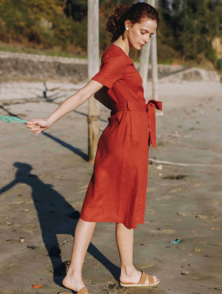 El vestido rojo de lino con botones está hecho con cariño y esmero en Galicia, en una apuesta consciente por la producción sostenible y ética respetando el km0.
